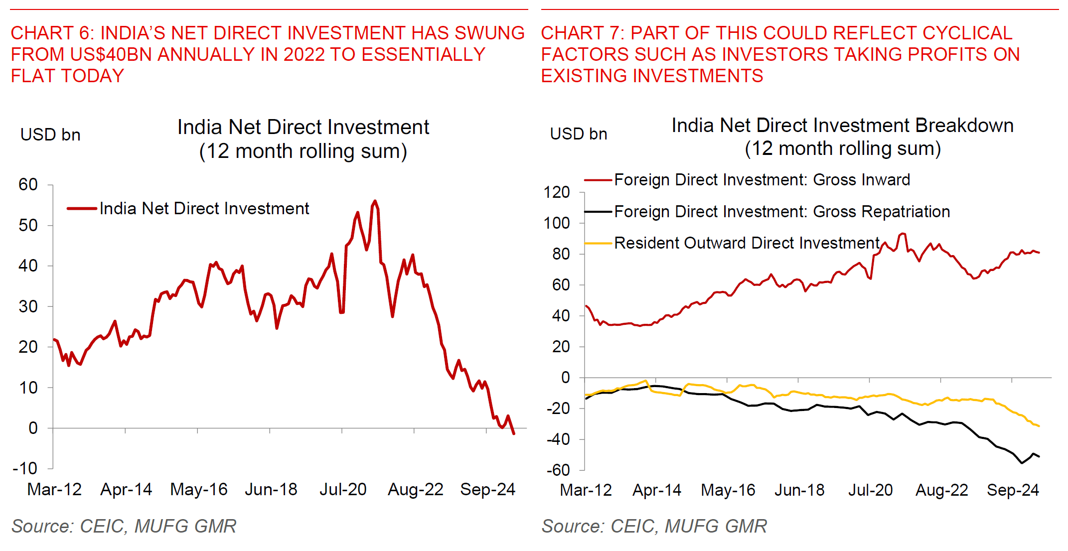 - Linking to a FX perspective, the important change in India’s balance of payments is a sharp decline in Net Direct Investment from around US$40bn annualised in 2022 and essentially flat today – in other words a US$40bn swing in funding of India’s current account deficit (see Chart 6 below).