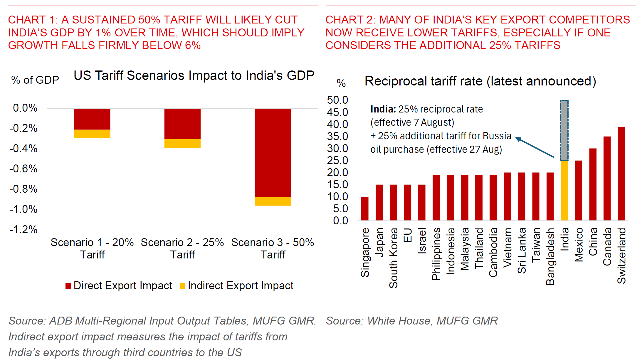 - With India’s growth also likely to fall below 6% with 50% tariffs, we think RBI will cut rates by 3 more times to 4.75% from 5.50% currently, more than our current forecast of 2 more cuts (5.00%). The central bank is also likely to allow more room for INR weakness to support export competitiveness if it looks clear that 50% tariffs were to be sustained.