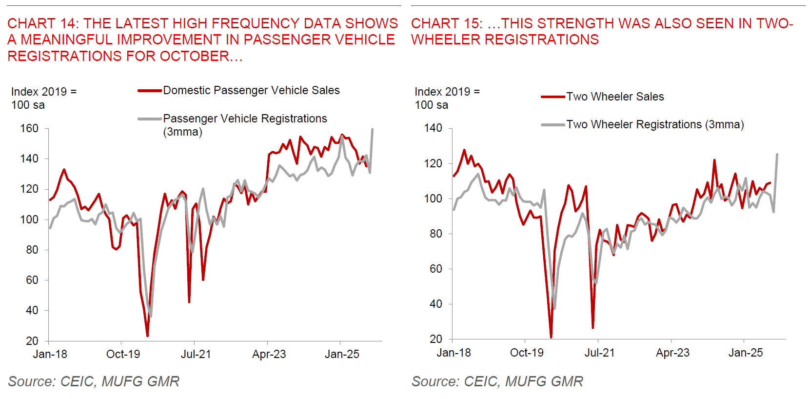 While it’s still early days of course, the latest high frequency indicators we have for October, together with anecdotal feedback from companies from news articles suggest that festive sales have been strong, supported by policy measures including GST tax cuts. For instance, registrations for passenger vehicles, two-wheelers, and tractors all registered sharp jumps in October based on the latest data that we have on hand. There were reports from a variety of brands and retailers, with many showcasing some of their highest Navratri sales in over a decade, ranging from 25 to 100% growth. The GST reforms and tax changes are reported to be an important contributor to the festive sales strength. In addition, we also think that underlying cyclical factors such as a decent Monsoon, good Kharif sowing and the moderation in inflation thus far continue to be domestic supports for demand outside of external tariff related risks.