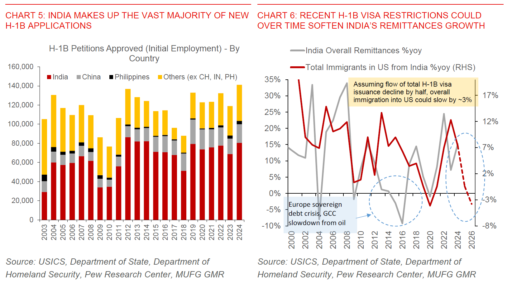 We see these tighter restrictions potentially resulting in slower remittances growth over time. Assuming the flow of total H-1B visa issuance from India declines by half, we estimate overall immigration into the US could slow by around 3%, which could translate to around a 0.1-0.2% of GDP reduction in remittances for India.