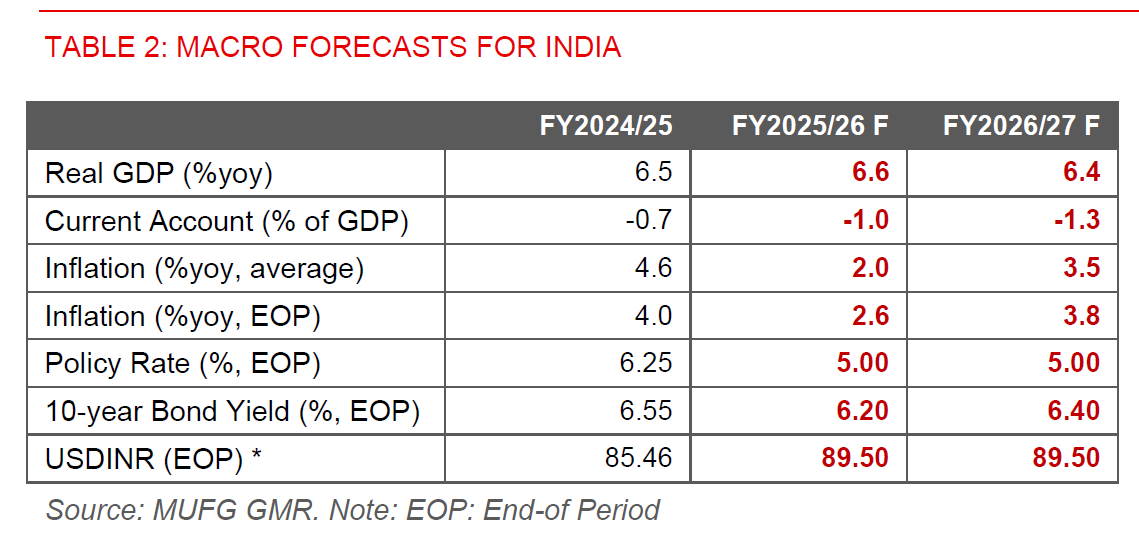 Beyond these external headwinds, our INR FX and rates forecasts also incorporate the offsetting positive impact of domestic structural reforms, including from recent GST tax cuts and simplification, together with RBI’s recent host of regulatory changes to improve credit flow and improve the ease of doing business, among other objectives.