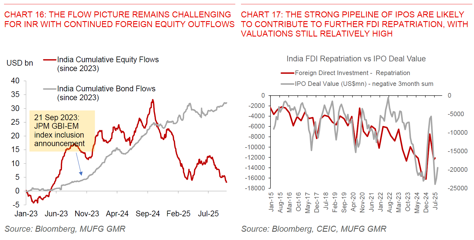 In the broader context of these push and pull factors, the flow picture for INR has not been too supportive, and as such we think managed INR weakness and underperformance continues to make sense. We have continued to see foreign equity outflows, higher FDI repatriation driven in part by a still strong pipeline of IPO listings, coupled with an expectation of a wider current account deficit from weaker exports, softer remittances, and a slowdown in IT services exports.