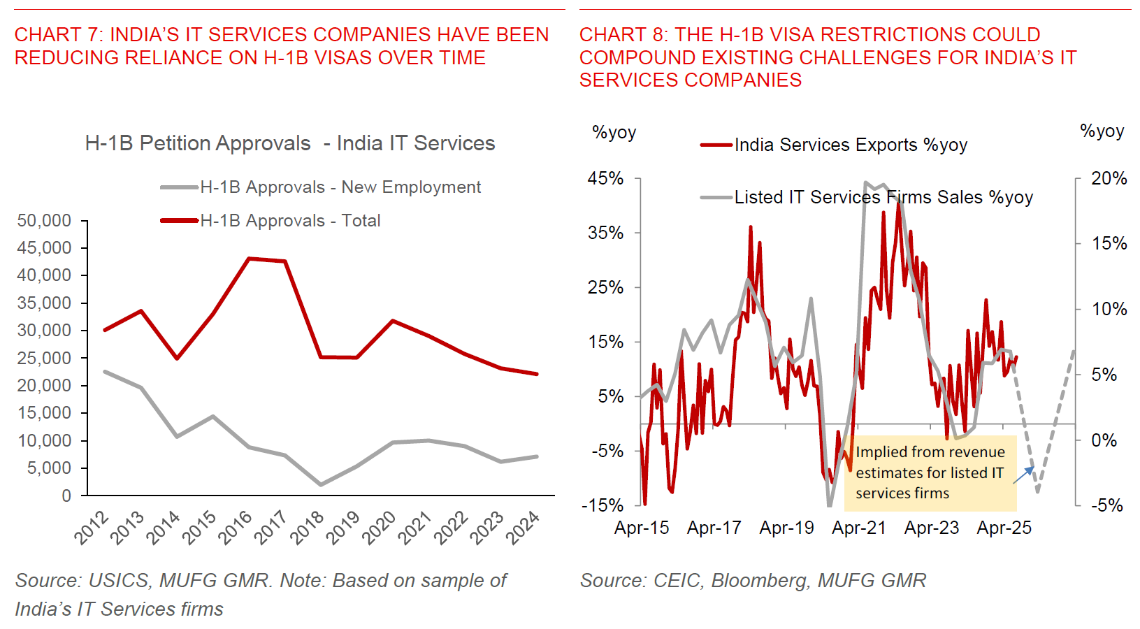 Beyond remittances, the impact to India’s IT services export revenues is uncertain from the direct impact of H-1B visa announcements. While India’s IT services companies could see some margin hit from requirements to hire more locally, there could conceivably be some additional activity offshored to India given difficulty of fulfilling all work onshore in the US based on the available talent pool.