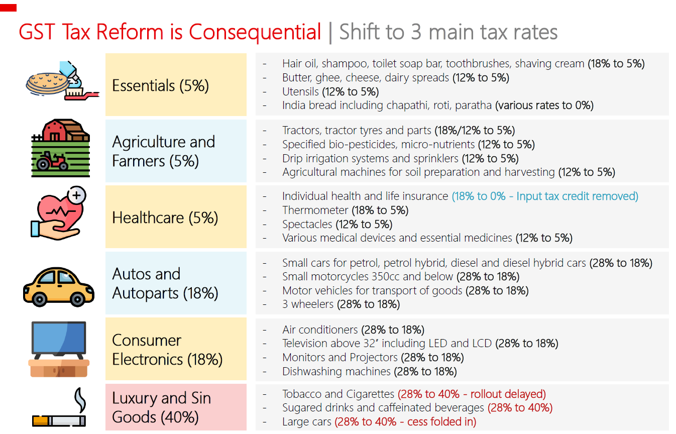 First, India announced its most consequential reforms to the Goods and Services Tax since the system was introduced in 2017 (see India: Most consequential GST reforms since 2017).