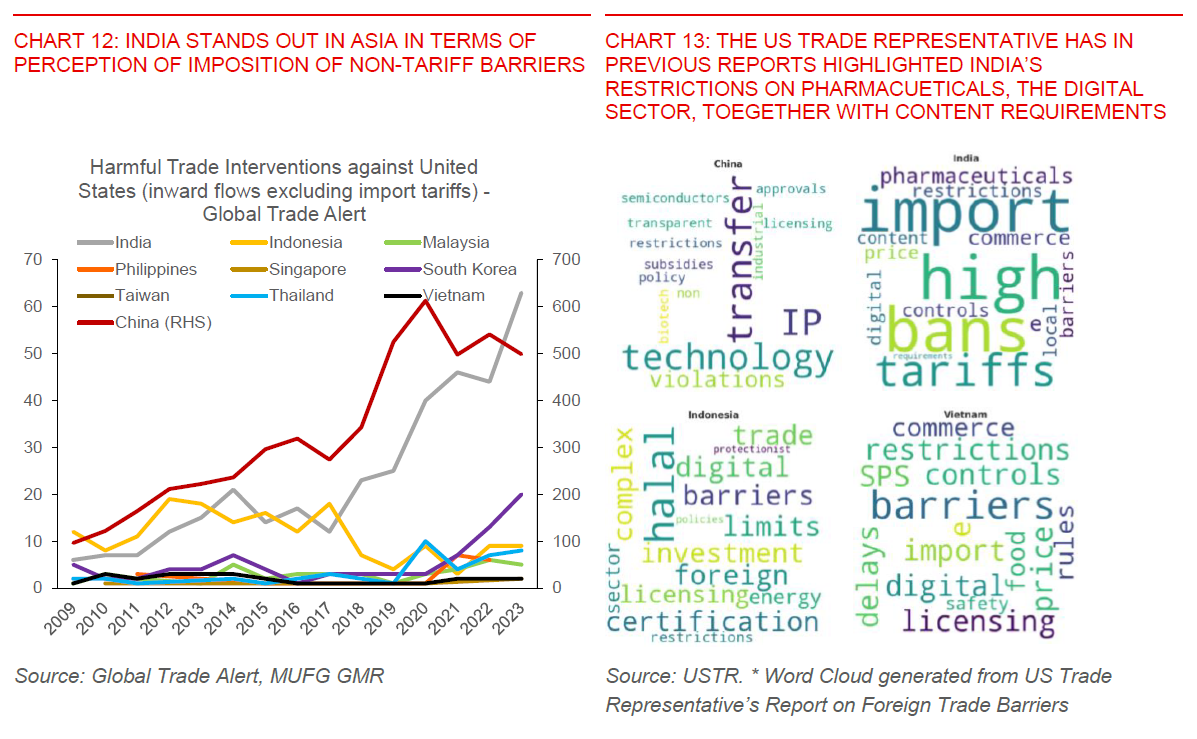 - In addition, India should in theory be quite vulnerable to reciprocal tariffs when looking beyond just tariff differentials. The Trump 2.0 administration has highlighted four other key criteria in determining reciprocal tariffs, namely: 1) taxes (such as value-added taxes and digital taxes), 2) non-tariff barriers (such as subsidies and regulation), 3) exchange rates and perceived deviation from market rates, and 4) any other criteria including unfair competition. Again, India stands out relative to other countries in the imposition of non-tariff barriers (see Charts 12 and 13 below), and also in terms of its implementation of digital taxes. There are signs that India is taking some steps to seek for exemption from reciprocal tariffs by lowering tariffs on certain goods and also removing its “digital tax” on some online advertisement services. Overall, it remains extremely unclear whether these moves will be successful.