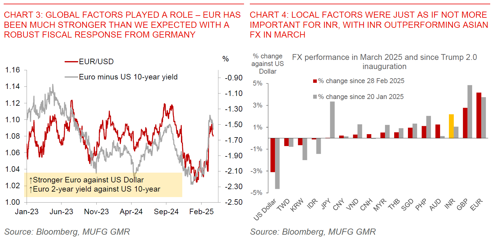 The key macro drivers were both global and more importantly also local factors as well. On the global front, EUR/USD has been much stronger than we pencilled in due to the much stronger than expected fiscal response from Germany, even as the forecasted path has been in line with what our global team has been expecting (see EUR/USD and G10 USD Forecasts Update – Three Questions). More importantly, INR has outperformed other Asian currencies in the month of March, indicating important local drivers underpinning India’s FX strength (see Chart 4 below).