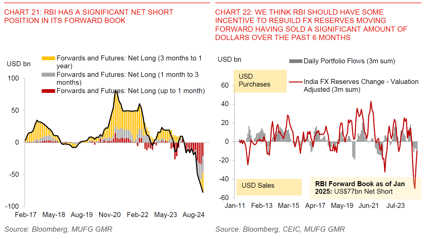 - Lastly, we think RBI should have some incentive to rebuild FX reserves moving forward. Admittedly, RBI has been much more hands-off than we anticipated, and as such also raises the question of whether we should anticipate greater two-way swings in USD/INR moving forward. Nonetheless, with RBI’s meaningful net-short position in its forward book (US$77bn as of Jan 2025), we think the central bank should increasingly have an incentive to rebuild FX reserves moving forward (see Charts 21 and 22 below).