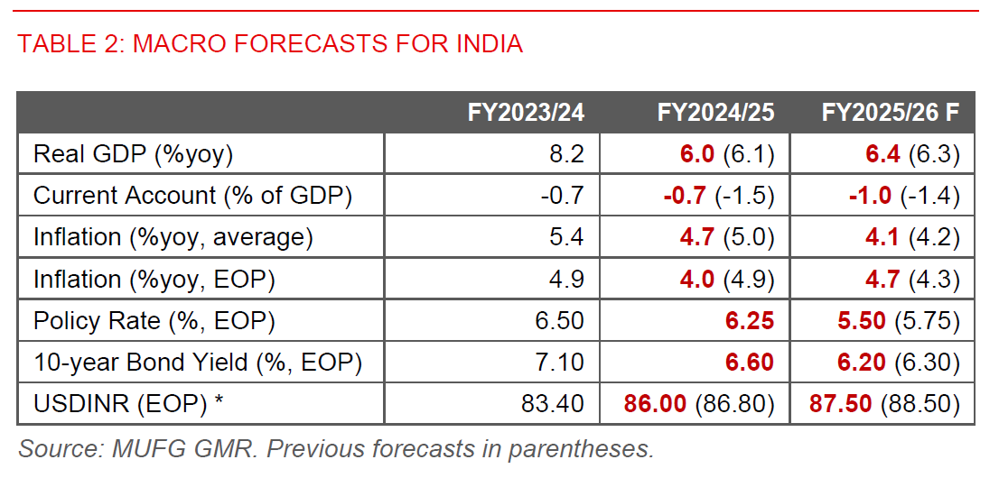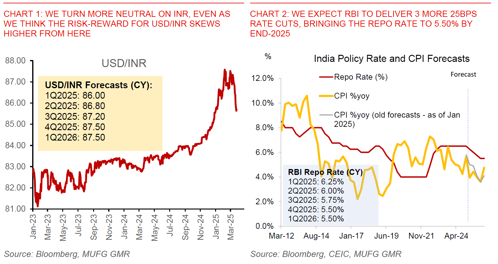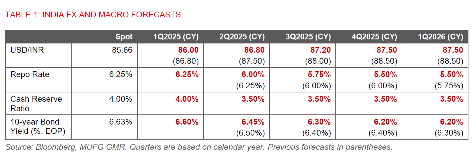 - We now forecast USD/INR at 87.50 by end-2025 (from 88.50 previously). We also expect RBI to deliver 3 more 25bps rate cuts for a terminal rate of 5.50% (from our previous forecast of 5.75%).