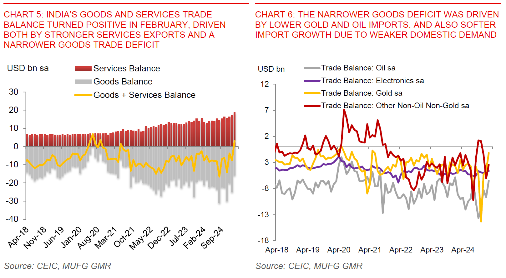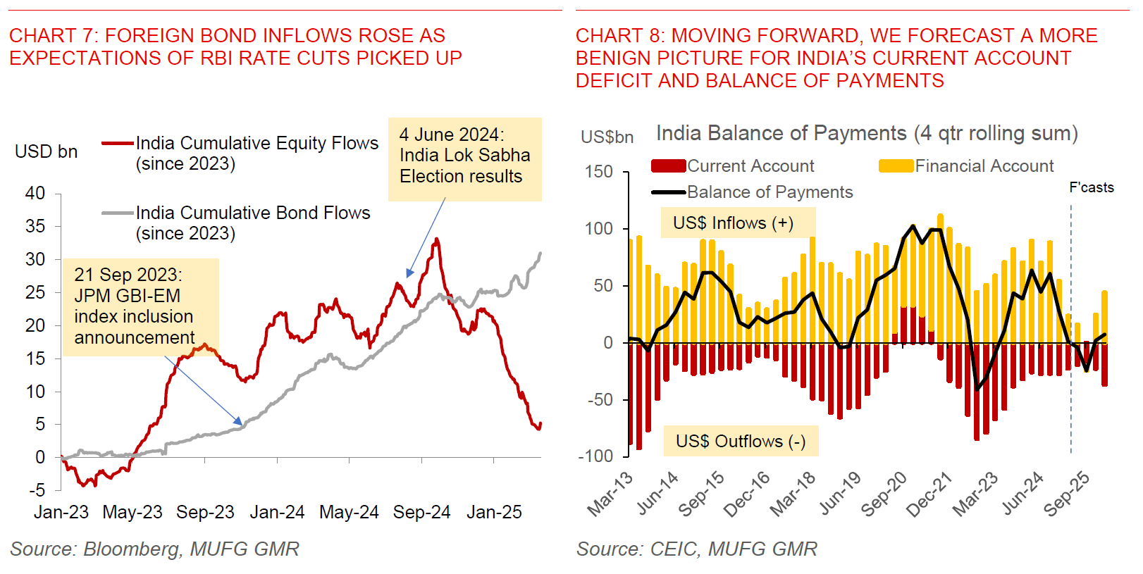 Among other things, this was likely driven by better macro data in India, with a narrower goods trade deficit, stronger services exports, lower than expected inflation print for February, and with that foreign bond inflows given rising expectations of RBI rate cuts (see Charts 5 and 6 below). There might also be some temporary factors such as rebalancing of key equity indices which were reported to bring around US$1.4-1.6bn towards the end of the month.