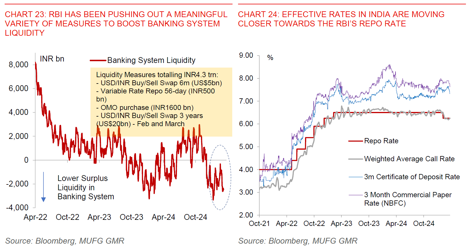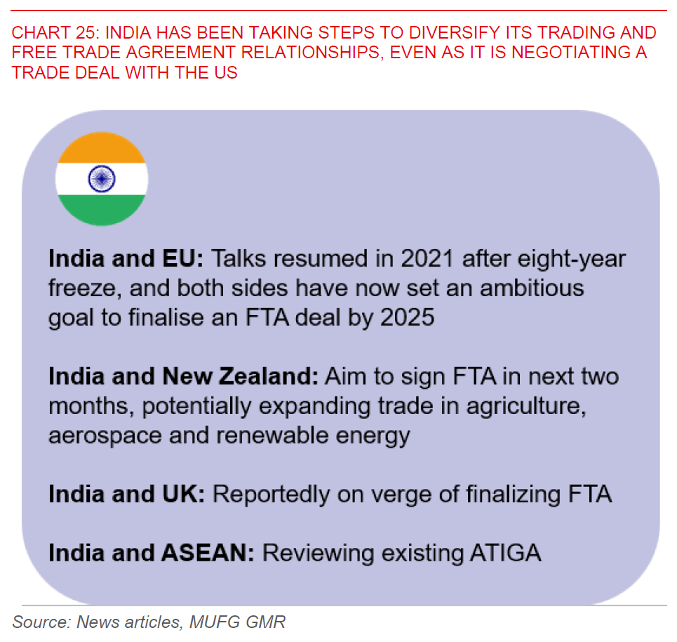 - The good news for India is two-fold, with more support to growth from monetary policy, and a possible push for structural reforms from the threat of tariffs: For one, we continue to expect RBI to pivot towards growth. We now forecast RBI to cut rates by 25bps in April, and again in August and December, bringing the repo rate to 5.50%. In addition, we think RBI will ease macroprudential restrictions further, while also pushing out more liquidity to lower effective rates. Second, we take it as a long-term positive that India is taking steps to diversify its trading relationships with partners such as the EU, UK and New Zealand, even as it is working towards a trade deal with the US.