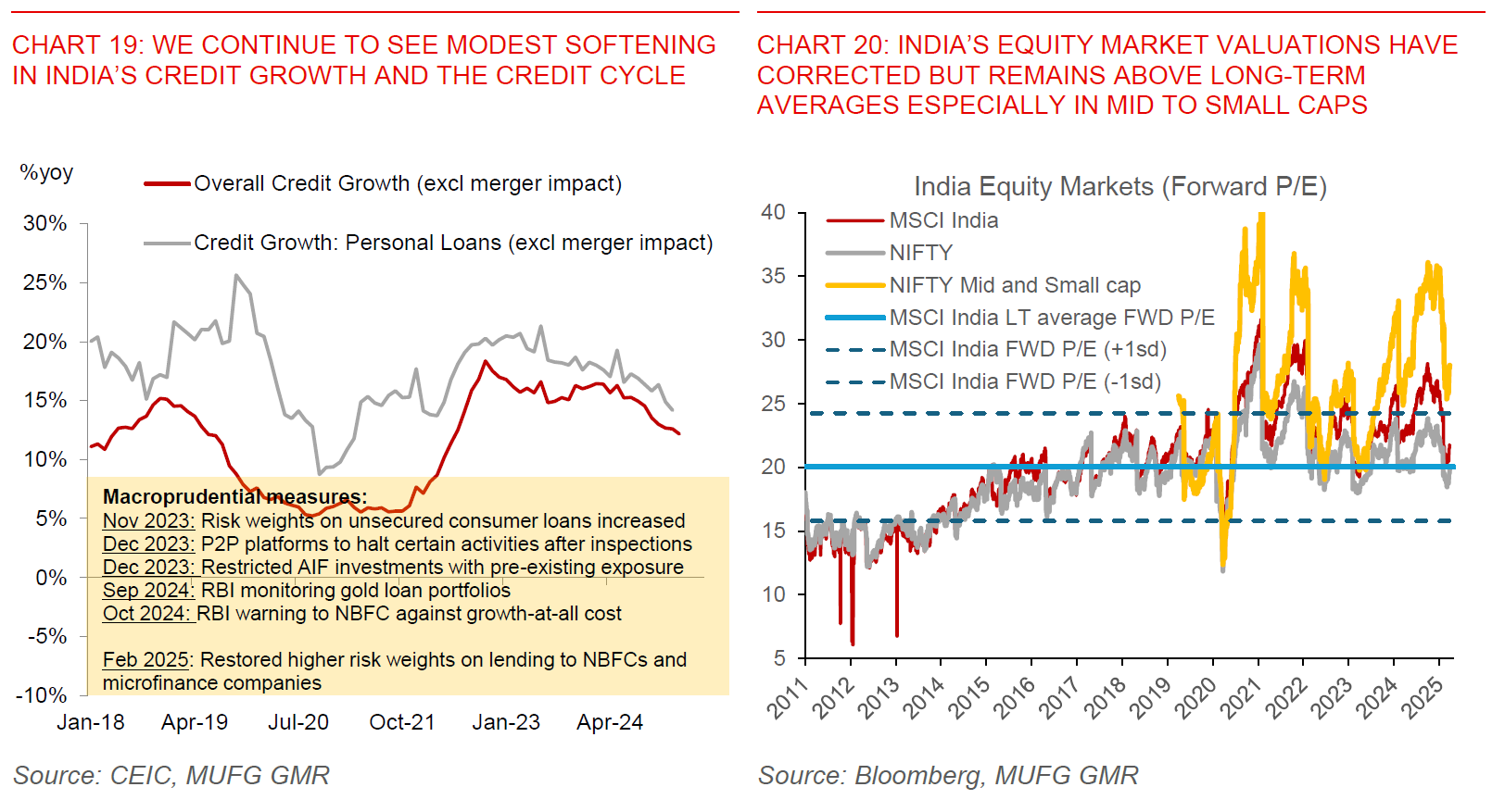 - The second key reason why we think INR should weaken from here is that growth could disappoint consensus expectations moving forward. Our tracking of high frequency indicators suggest that domestic economic activity seems to have softened in March, following a bounce heading into January which was possibly boosted by a key religious event held earlier this calendar year (the Kumbh Mela). Growth remains somewhat soft at around 6-6.5% (relative to the 7-8% rates seen previously), weighed down by the lagged impact of RBI’s macroprudential measures, slower credit growth, a modest deterioration in the credit cycle, coupled with slower disbursement of public infrastructure projects. Nonetheless, the government’s recent income tax cuts coupled with easier policy settings should help support growth moving forward. Overall, we forecast growth at 6% in FY2024/25 and picking up to 6.4% in FY2025/26, but importantly still below consensus expectations. Equity market valuations have corrected but nonetheless remain above long-term averages especially in mid-to-small caps and so the incremental foreign flow moving forward could still be somewhat challenging (see Chart 20).
