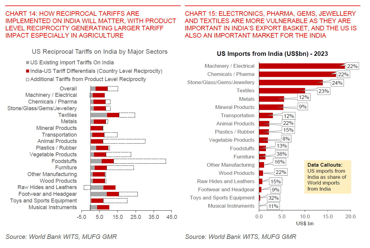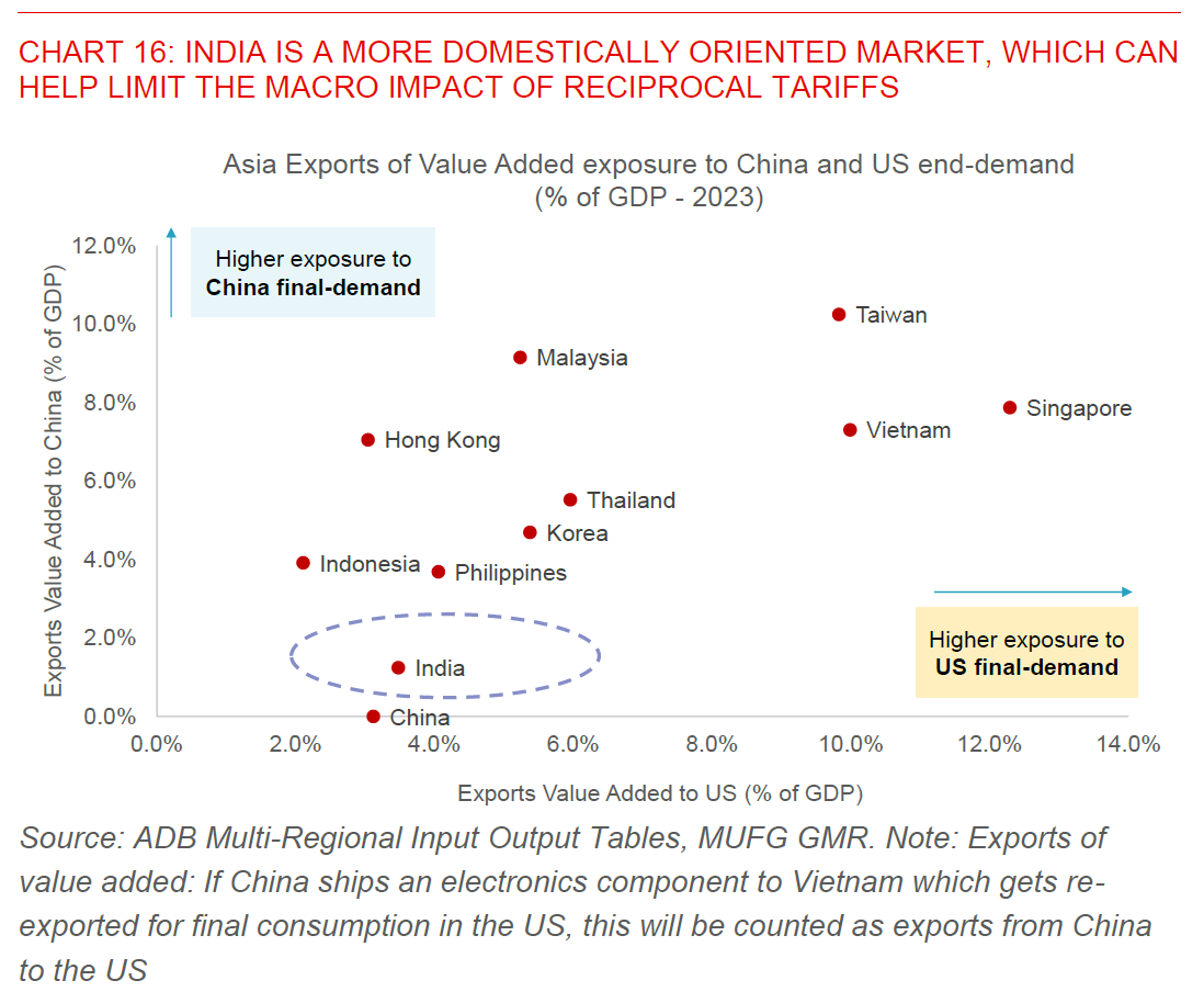 Overall, we think markets are underpricing the risks of reciprocal tariffs on India right now. While India is generally more domestically-oriented to begin with, reciprocal tariffs if raised to a meaningful level will still have a negative impact on India’s growth prospect in 2025. We note that India’s gross exports to the US makes up around 2% of its GDP, while India’s exports of value added to the US (which takes into account exports through third countries) makes up around 4% of its GDP, which overall is smaller than other Asian countries but could still weigh on India’s growth prospects in 2025. The impact could also be quite concentrated on sectors such as electronics, pharmaceuticals, gems and jewellery, and textiles given that the US is an important end-market for these products.