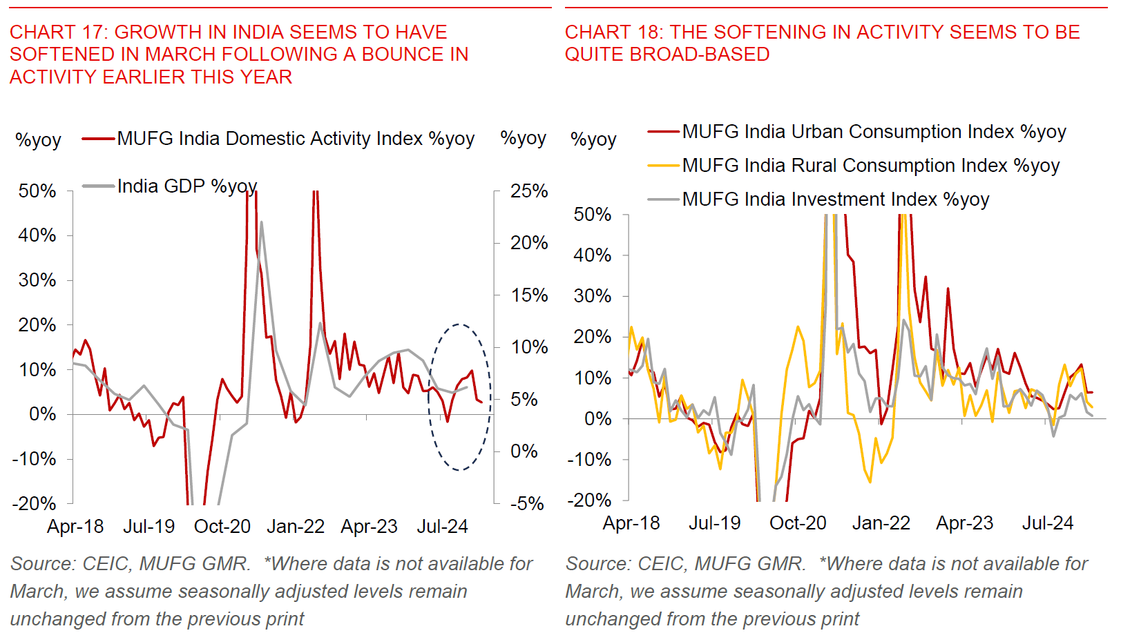 - Nonetheless, we think the risk-reward for USD/INR skews higher from current levels with the big move in FX markets. First, we think markets are underpricing the risk of reciprocal tariffs on India. Second, India’s growth remains relatively soft and is likely to disappoint expectations in our view, with market valuations still quite high. Third, inflation while softer may rise in the coming months with forecasts of heatwaves. Fourth, our team continues to forecast Asian currencies to weaken into 2Q. Lastly, RBI should at some point come in to build FX reserves, even as it has been more hands-off than we anticipated so far.