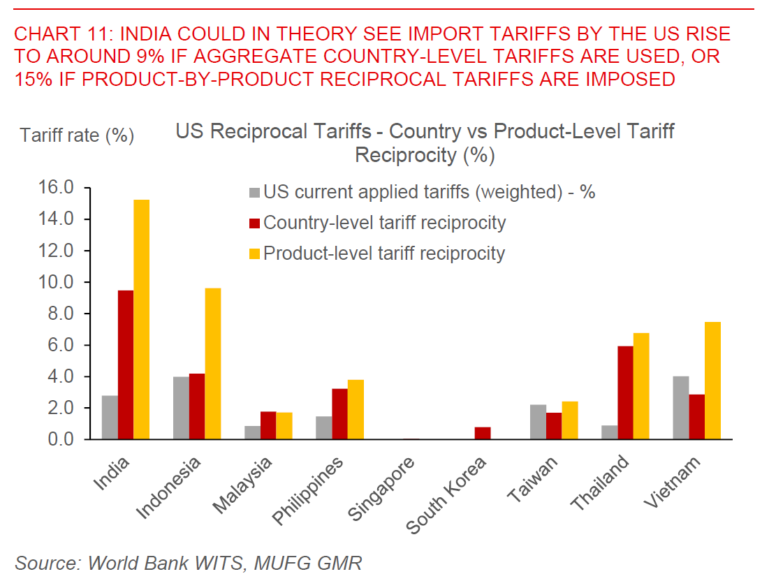- First, we think that markets are under-pricing risks from Trump’s reciprocal tariffs specifically for India come 2 April. India should in theory see the sharpest rise in reciprocal import tariffs by the US in Asia. Assuming the Trump 2.0 administration uses aggregate differences in country-level tariff rates, the US could raise average tariffs on India by an additional 6.7%, bringing it to 9.5% from 2.8% currently (see Chart 11 below). In addition, if product-level reciprocity were followed, US could raise tariffs on India to 15%. Ultimately, we think product-line reciprocity is highly unlikely given the significant complexity both in determining the tariffs, and also in enforcement not just for India but across a whole host of trading partners for the US. Nonetheless, our broader point still stands that India should be more vulnerable looking at tariff differentials alone.