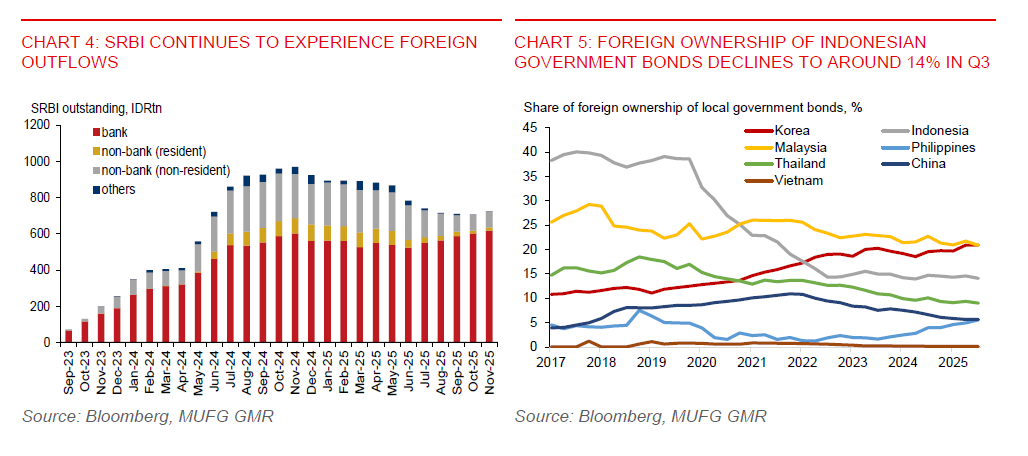 Despite the rate hold, the rupiah faces headwinds from fiscal risks and narrow yield spreads versus the US. We expect USDIDR to trade in the 16,700-17,000 range in 2026. While the government targets a 2.68% fiscal deficit for 2026, we anticipate a wider deficit of around 2.9% of GDP. Investor sentiment has weakened, with foreign holdings of SRBI falling to IDR86.6tn in November from IDR224.2tn in Dec 2024. Portfolio investment posted a USD7.1bn deficit in Q3, following USD8.1bn deficit in Q2, underscoring persistent external pressures.