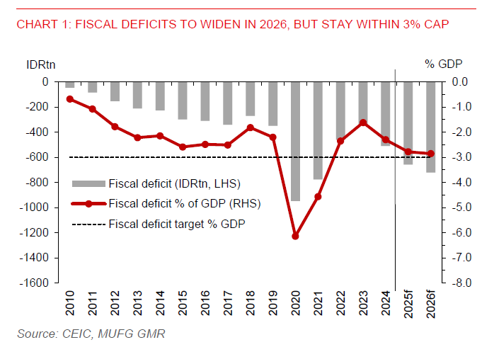 We maintain our view that the 2026 budget appears conservative relative to the 5.4% GDP growth assumption underpinning the budget and Prabowo’s social policy agenda. The budget targets a 2.48% deficit in 2026, narrower than the 2.78% target for 2025. We expect fiscal consolidation will be delayed, and we maintain our outlook for the fiscal deficit to widen to 2.9% of GDP, implying modest fiscal impulse of +0.1% of GDP.