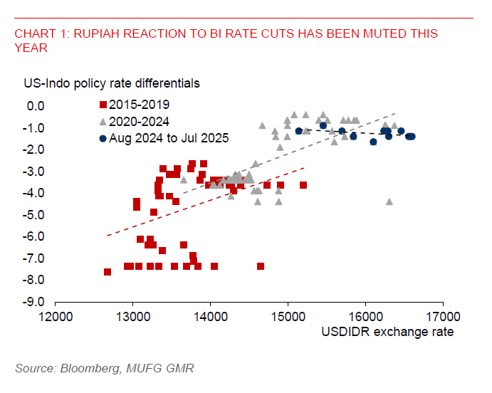 - Monetary policy will become more accommodative to support growth. Bank Indonesia cut its policy rate by 25bps to 5.25% in July, and we expect further easing to 5.00% by end-2025, with a terminal rate of 4.50% to be reached by Q2 2026. While lending rates have fallen, monetary transmission has been relatively modest so far, suggesting the need for further BI policy easing to support bank credit growth and domestic demand. Notably, the rupiah has been less sensitive to BI rate cuts so far this year, reinforcing our view that BI can ease further without destabilising the currency.