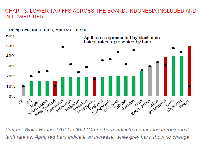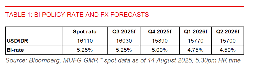 - We forecast USD/IDR to fall to 15,890 by end-2025. This will be supported by resilient domestic economic fundamentals and supportive macro policy support, which could help cushion the impact of trade headwinds. Tariff risks also appear to be contained. This, along with Indonesia’s stronger-than-expected Q2 GDP growth, has led us to revise up our 2025 GDP forecast to 4.8%, from 4.7% previously. Indonesia’s 19% US tariff rate, while higher than the 10% baseline implemented in April, is notably lower than the 32% threatened. It also broadly aligns with the tariff rates applied to other ASEAN peers, helping to preserve export competitiveness.