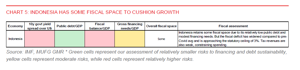 - While higher US tariffs will negatively impact growth, we expect macro policy to provide a partial offset. Notably, Finance Minister Sri Mulyani has recently revised the fiscal deficit target to 2.8% of GDP deficit in 2025, up from the previous 2.5% deficit, signalling a more fiscal accommodative stance. Our assessment of Indonesia’s fiscal space, which takes account of its fiscal deficit and government debt profile - suggests there is room for policy manoeuvre to support growth. Meanwhile, Bank Indonesia has maintained a dovish tone, despite holding rates in June. Bank Indonesia Governor Perry Warjiyo, in recent parliamentary remarks, indicated that the central bank remains committed to supporting growth. We look for BI to cut rates in Q3, possibly as early as this month, ahead of our earlier projection for a September move.
