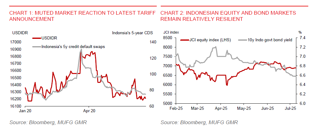 - The Indonesian markets have shown a relatively muted reaction to the latest tariff announcement, with the rupiah weakening only modestly against the US dollar. Weak sentiment toward the USD has helped cushion the impact, contributing to subdued USDIDR reaction. This pattern of modest FX market movement is also broadly reflected across other Asian currencies. Looking ahead, Trump seems to have retained the option to revise tariff rates before their scheduled implementation on 1 August, leaving room for further trade negotiations.
