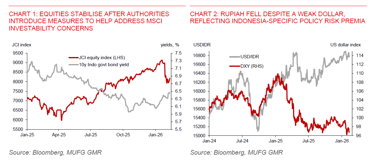Despite solid growth momentum in Q4, Indonesia enters 2026 with increased policy and market uncertainty. MSCI has raised concerns over the investability of Indonesian equities, while Moody’s has revised Indonesia’s sovereign credit outlook to negative, placing downward pressure on local financial markets.