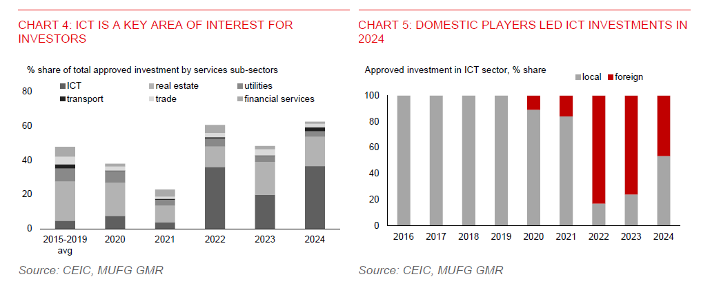 - A large share of approved investment is contributed by domestic players, which could partially offset the impact from delays and cancellations by export-oriented firms. The investment surge has also been marked by a notable increase in approved ICT investments (> 1/3 of total approved investments). Domestic players led the charge in 2024 (> 50% of approved ICT investments), while foreign players remain strong (+30%yoy in 2024).
