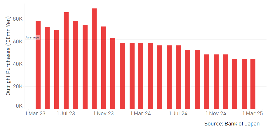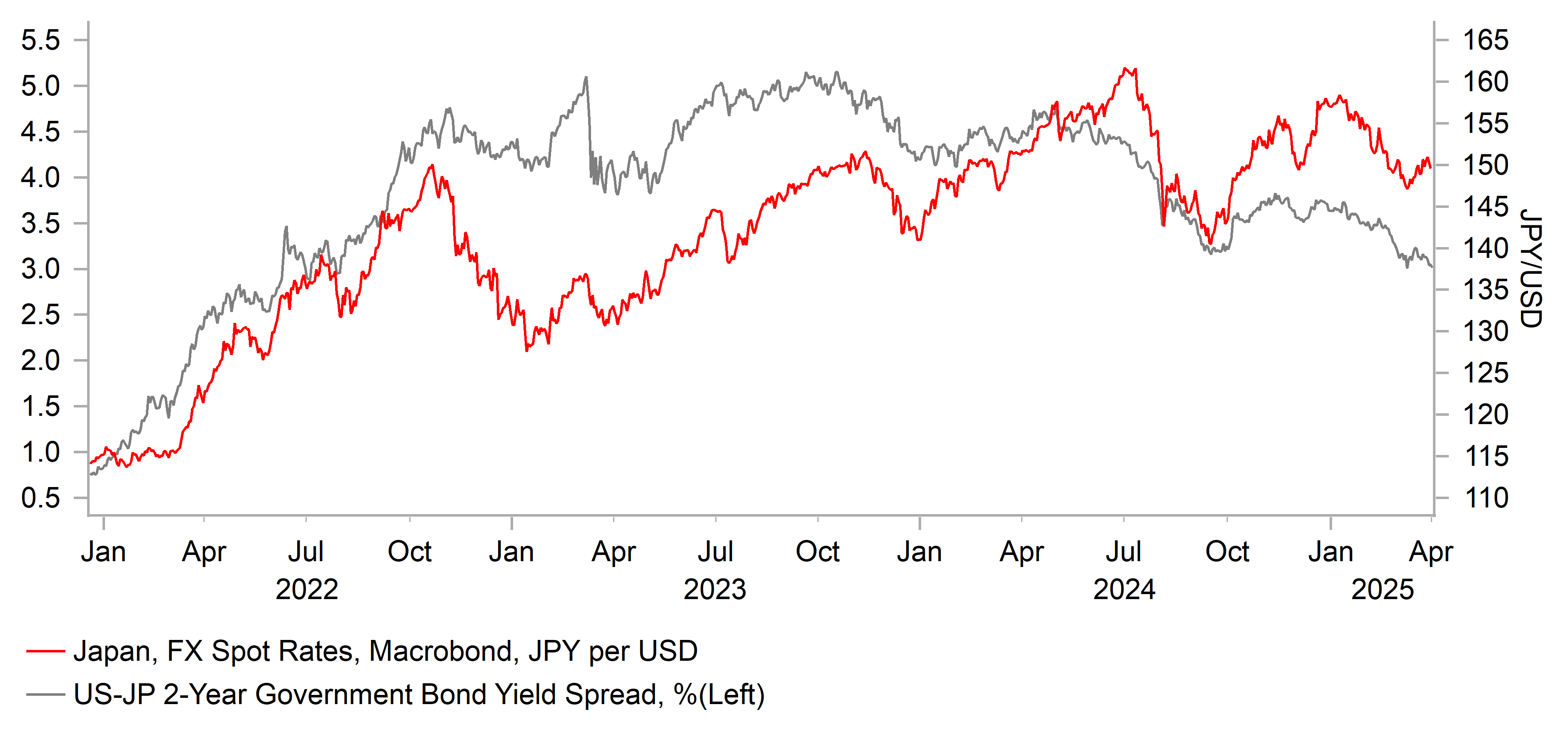 The 10-year JGB yield increased again in March, by 11bps to close at 1.49%. The JGB yield move was in part sympathy with global yields, in particular in Europe, following Germany’s plans for a substantial increase in fiscal spending. Yields in the US were unchanged in March and hence once again the US-JP 10-year yield spread narrowed a further 11bps. The spread has now declined 85bps since the middle of January and at levels below 280bps is consistent with a much lower USD/JPY. The 10-year JGB yield has gained more than we had expected and hence we have raised our forecasts (from 1.50% in Q3 & 1.60% in Q4) given we see scope for investors gradually adjusting higher the implied terminal rate for the BoJ policy rate. Stronger inflation is more apparent today and the higher wage growth coming through and rising rental inflation and food prices will likely keep the BoJ on track to hike twice by January 2026 which is not priced in the OIS market. The primary risk to the view is a larger equity correction globally due to trade tariffs hitting growth and corporate earnings, prompting a larger USD/JPY drop and a BoJ pause