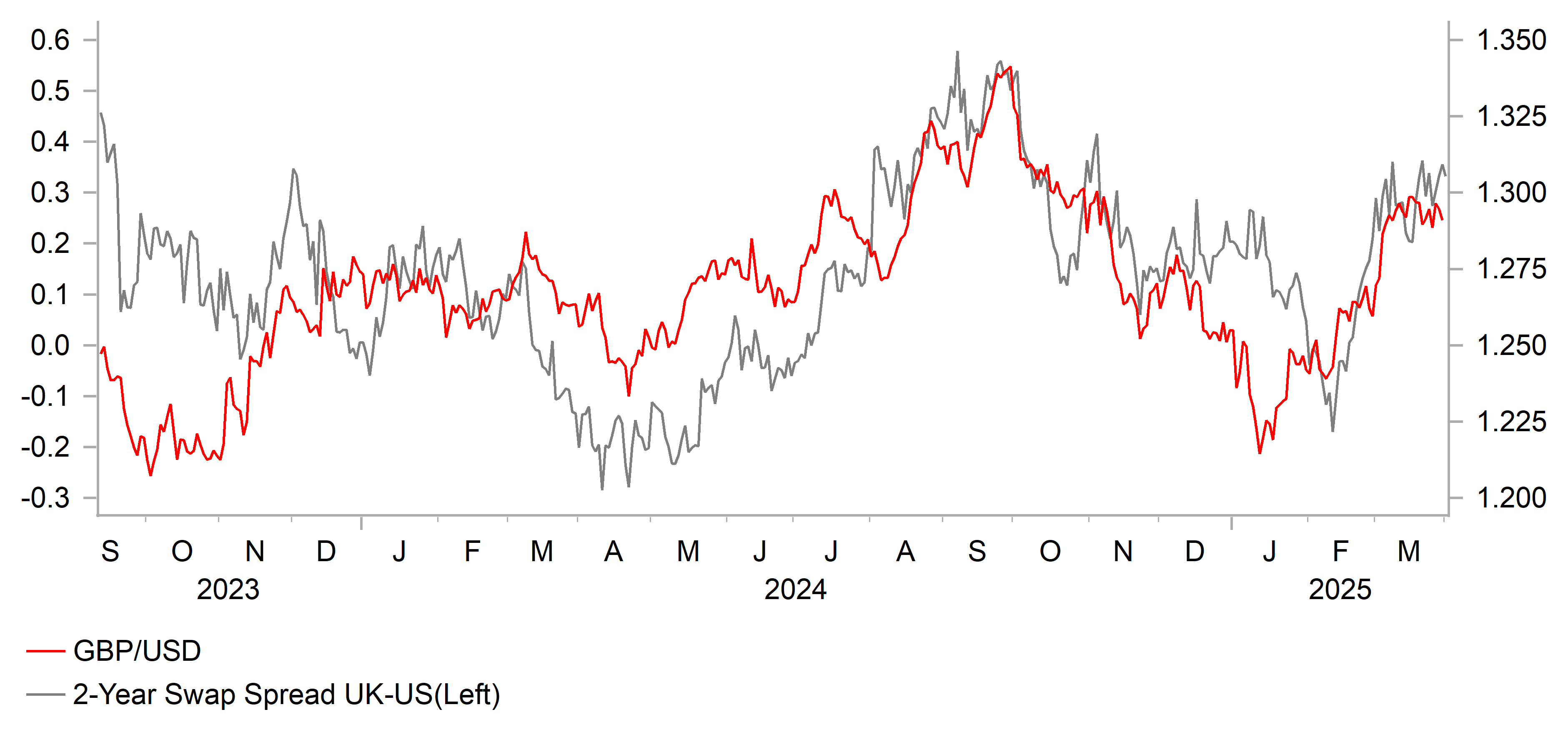 However, the cloud of uncertainty over US trade tariff policy could serve to undermine the euro over the short-term. President Trump has announced a 25% tariff on global auto and auto parts imports that will negatively impact the euro-zone. According to the European Automobile Manufacturers’ Association (ACEA) in value terms, the US was the largest exporting market for the EU in 2024 worth EUR 38.5bn, although that was a decline of 4.6% versus 2023. We do not know the details of reciprocal tariffs to be announced on 2nd April but the EU’s Trade and Economic Security Commissioner, Marco Sefcovic has indicated his belief that the EU could be hit with a 20% tariff on all US imports. President Trump appears to have singled out the EU and we see greater risks of more aggressive action focused on Europe than elsewhere which could initially at least prompt some renewed EUR selling. The ECB is nearly fully priced for cutting the policy rate 25bps below the neutral rate of 2.00% but the two and three-year OIS pricing are higher pointing to a lack of conviction on policy being sustained below the neutral level. More aggressive tariff action might see more ECB cuts being priced that will then pressure EUR to the downside.