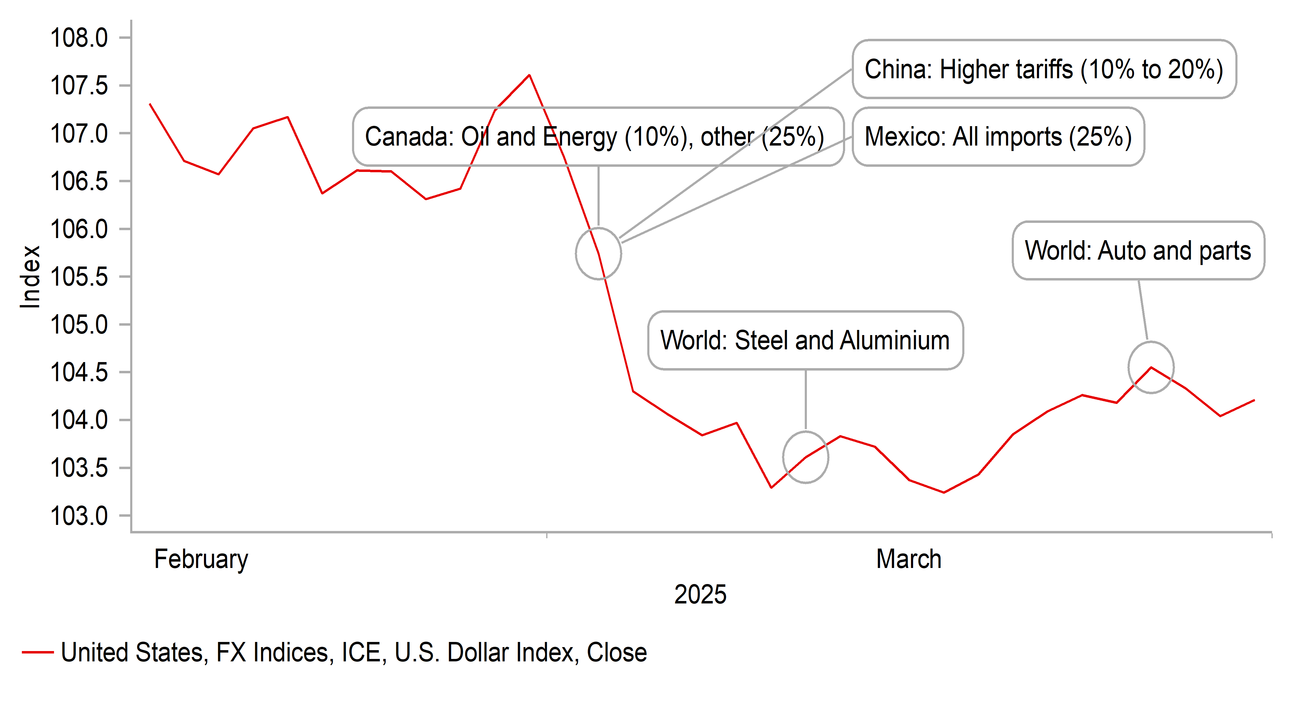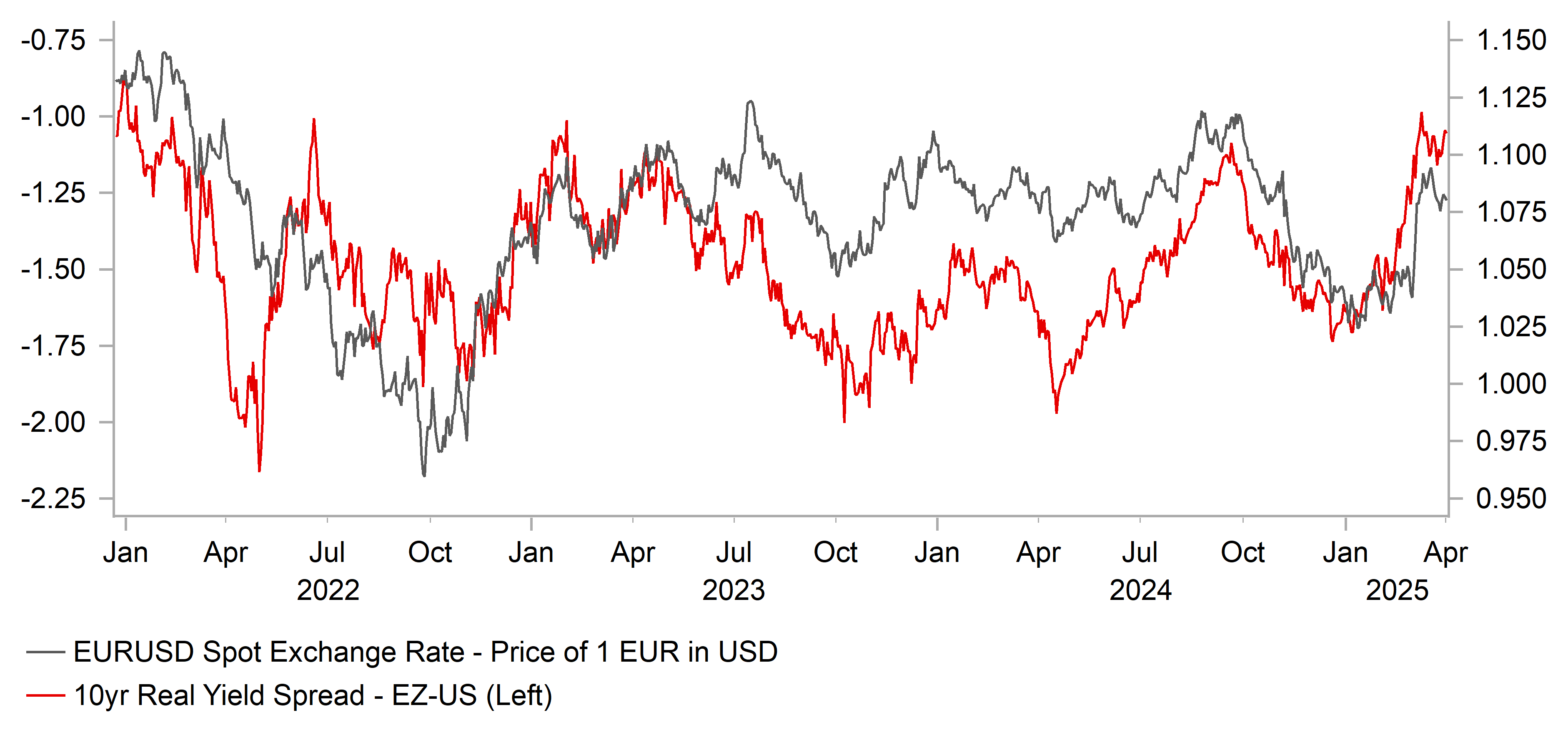 We have raised our EUR/USD forecast profile for each quarter this year by between 3-5 big figures and our first Q1 2026 estimate implies a 5%-6% appreciation in EUR/USD from current spot. However, given the sharp gains in March and given the tariff uncertainty, we see limited scope for further upside until later in the year.