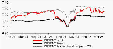 CNY had remained largely stable (+0.4%) against the US dollar thanks to the much weaker US dollar (DXY index down by 3.1%). That said, the USD/CNY fixing was kept at around the 7.1700-level with no intention from the PBoC to meaningfully adjust it lower. USD/CNY spot is currently trading at the mid-point between the fixing level and the upper band. We interpret it as the PBoC sending a message to the market that CNY movement will not be easily swayed by market movement, be it CNY-positive (e.g., weaker DXY) or negative (e.g., US tariffs), and that a stable currency is their preference. Judging from recent economic data, we think the negative impact of the tariffs has yet to be reflected in the economy and therefore the current USD/CNY level has not priced in much of that risk. While China has diversified its exports trade from US since trade war 1.0, the US remains a significant export market for China (second largest exports market after ASEAN with 14.7% share) and the negative impact of the tariffs will be felt eventually. As such, we expect further CNY weakness but only a modest move given we expect a weaker US dollar in 2H 2025 and renewed easing by the Federal Reserve. We think USD/CNY will reach a peak of 7.4000 by Q2 2025, which also factors in a PBoC rate cut in Q2.