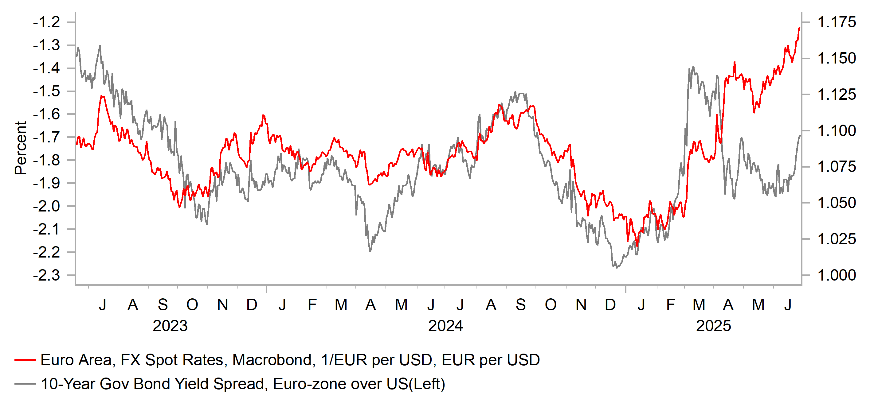 We have raised our EUR/USD forecasts by two to three big figures (previous Q3; Q4; Q1 2026 1.1500; 1.1800; 1.2000) reflecting the unanticipated speed of the move higher to this point and the still relatively conservative pricing for Fed rate cuts through H2 compared to our expectations. We have maintained our view that the ECB will cut on two further occasions this year based on the assumption that the US will introduce a 20% reciprocal tariff on the EU. The communication from President Lagarde was certainly consistent with the ECB ending its back-to-back pace of cuts and moving to a quarterly pace. If the reciprocal tariff plans prove less than expected for the EU or globally, the ECB may be more cautious in cutting. ECB officials have been clear that they believe the job of bringing inflation back under control has been achieved and to cut further would reflect risks to the downside for inflation. A credible inflation targeting track record and a AAA sovereign credit at the heart of Europe could well prove attractive for global investors seeking to diversify away from the US and ECB bond flow data does show a stable, notable inflow from abroad.