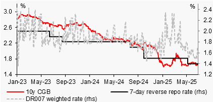 Our call for a mild increase of USD/CNY largely rests on a weaker growth outlook for China’s economy. We expect a growth slowdown from 5.4% in Q1 to 4.2-4.3% in Q4 putting downward pressure on the CNY albeit partly offset by broad-based US dollar weakness. Our FX forecast considers a potential final tariff imposed by US on its imports from China not much different from current 41%. Recently, Howard Lutnick told Bloomberg that China is going to deliver rare earths to US and once China did that, “we’ll take down our countermeasures”. We think that the focus of tariff talks between US and China may be more on exports and investment/technology restrictions, rather than tariff rates. China’s Ministry of Commerce confirmed the news of a finalized trade framework with the US on 27th June, with China to review and approve eligible exports application of controlled-items and US to correspondingly cancel a series of restrictive measures on China. We are aware of the mild strengthening of CNY recently, but it was mainly driven by external factors and with minimal pricing-in of the domestic stress ahead, in our view. The PBoC’s lower USD/CNY fixing recently is likely reflective of the weaker US dollar trend, not shifting of preference for a stronger CNY. A potential PBoC rate cut and weaker exports in Q3 and H2 due to dissipating front-running exports are set to weigh more on the CNY.