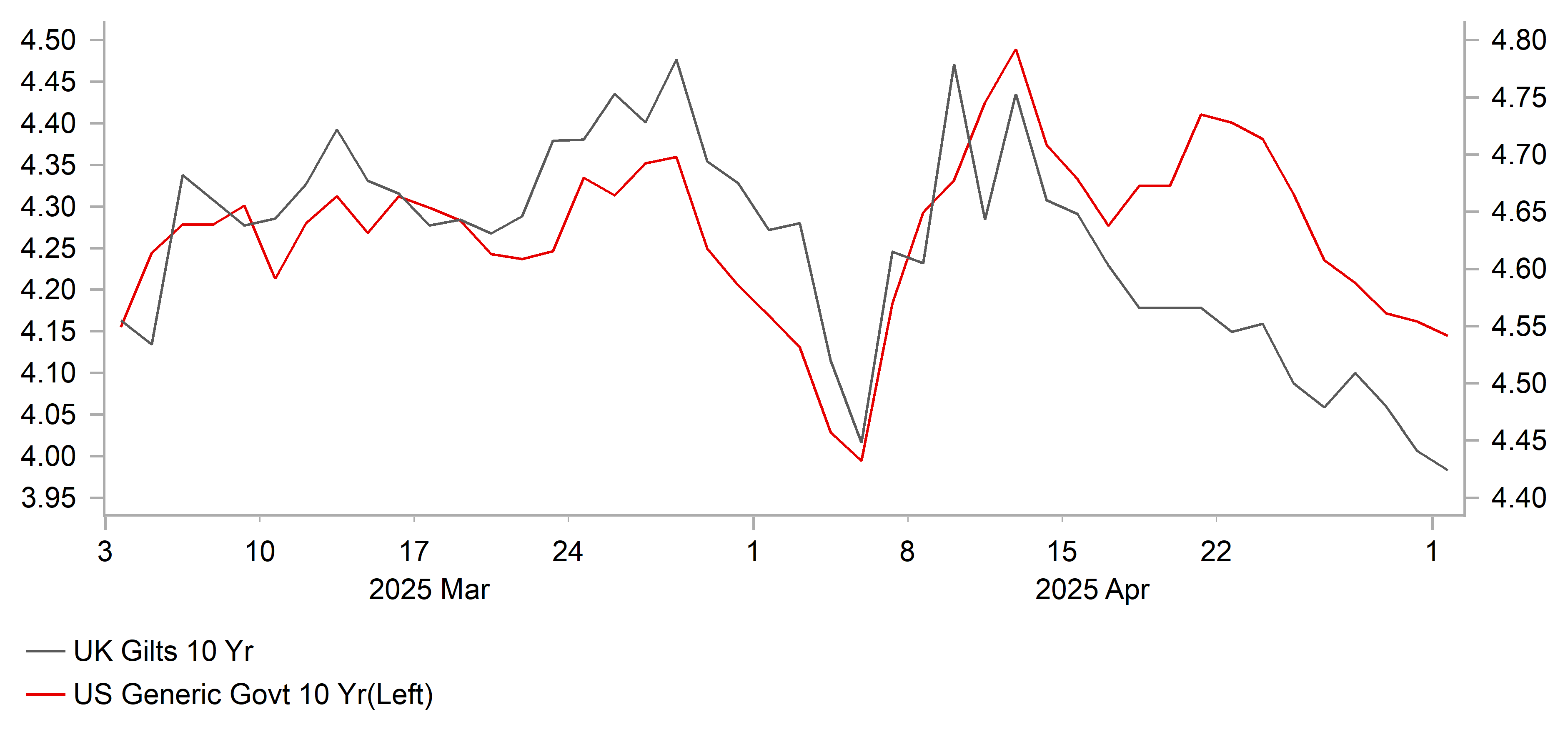 The 10-year bund yield fell notably in April, by 30bps to close at 2.44%. The drop in April means that the surge higher in the 10-year yield on 5th March in response to the German fiscal stimulus announcement has fully reversed. The donward pressure on yields in April came primarily from concerns over growth due to the reciprocal tariff announcement by President Trump on 2nd April which included rates way higher than investors expected. A 20% rate for Europe was suspended until early July in order for negotiations to take place. Given the large US trade deficit with the euro-zone it seems more likely than not that the 20% rate will go live in July and hence some degree of retaliation against the US is likely. Most ECB officials seem to view the tariff uncertainty as disinflationary and with growth set to remain weak and with China and Asia goods potentially set to boost supply into the euro-zone, we see the ECB delivering further easing. We have added an additional 50bps of easing for this year. The risk to this view is that retaliation from the EU is more aggressive than expected, leading to greater ECB caution. Still, based on our view and modest declines in UST yields, we expect only a modest rise in bund yields.