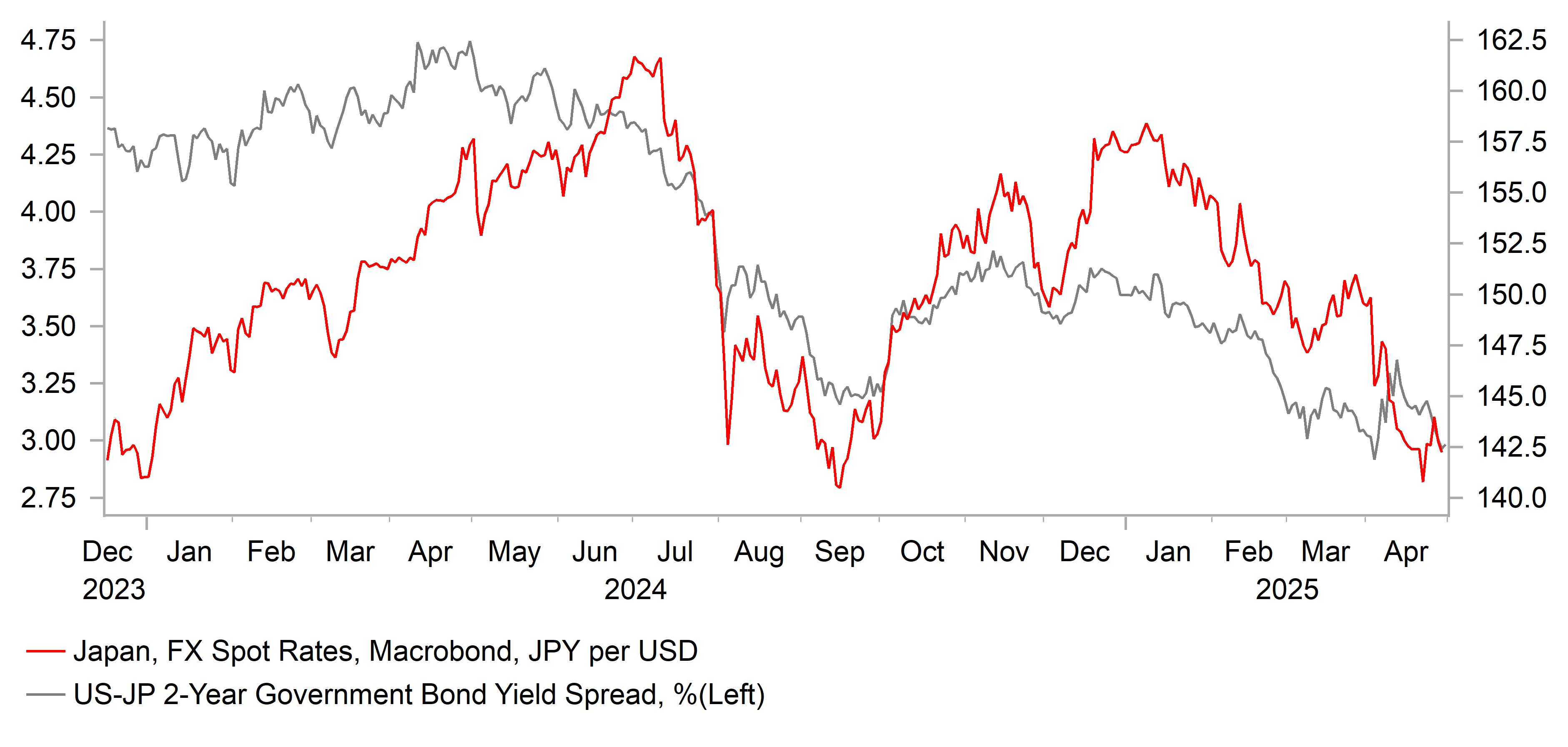 The 10-year JGB yield declined in April, by 17bps to close at 1.32%. The US Treasury 10-year yield declined as well but the JGB yield move was much larger. The larger move reflects to some degree the expected impact from Trump’s trade tariffs with the inflation risk much higher for the US than elsewhere globally. The expected hit to global trade and growth raises questions over the ability of the BoJ to follow through with further rate hikes. So far, the communication from the BoJ has been consistent with increased caution but still an intent to raise rates if economic conditions continue to unfold as the BoJ expects. At this stage we are maintaining our view that the BoJ will be in a position to hike two more times by Q1 2026 given the structural changes in Japan point to sustained inflation going forward. The risk to this view is a further sharp pick-up in global financial market volatility, a US recession and a sharp appreciation of the yen. The risk at this juncture is certainly that the BoJ may deliver less and that JGB yields are lower but conditions would need to deteriorate notably to derail the BoJ completely from hiking again.