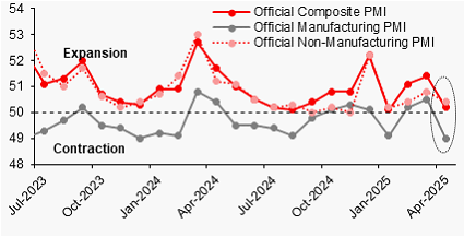 China’s 1Q GDP growth of 5.4%yoy was a positive surprise to us and the market, and March’s monthly macro numbers were largely better-than-expected as well with improvement in the growth of exports, industrial production, FAI and retail sales. Overall the economy remained in deflation with the GDP deflator falling by -0.8%yoy, and the housing recovery remaining sluggish in March. We expect GDP growth to decelerate in Q2, as the negative impact of tariffs materializes and large fiscal easing may only arrive in Q3 and beyond. April’s weaker official PMIs were a harbinger for the upcoming economic stress. The manufacturing PMI declined sharply from 50.5 in March to 49.0 in April, especially dragged lower by a sharp decline in new export orders from 49.0 to 44.7. The non-manufacturing PMI reading declined to 50.4 in April from 50.8 in March. The composite PMI posted a quite mild expansionary reading of 50.2 compared to 51.4 in March. Meanwhile, Bloomberg’s high-frequency data shows the 15-day rolling total of laden container ship tonnage (in TEU) for departures from China to the US has dropped significantly from 462k on 22nd April to 317k on 29th April. The latest reading is way below the 2024 daily average of 420k.