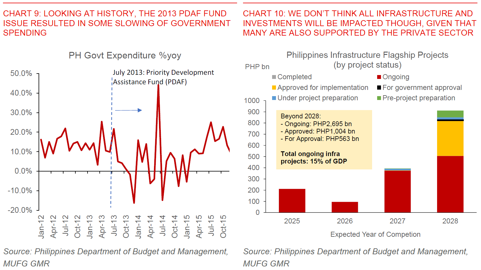 The government has been increasing allocation to flood control projects over time, rising to around 1% of GDP in the latest budget – and for good reason, given how the Philippines is vulnerable to the physical impact of climate change. With the government now reallocating this budget to other areas, coupled with increased scrutiny on other areas of spending, we think it is likely that there is a slowdown in government spending as we head into 2026. This is likely to weigh on growth to some extent and at least partially offset other positives such as lower rates and inflation. The 2013 episode of the Priority Development Assistance Fund issue, or more colloquially known as the pork barrel funds, provides some historical example of a possible impact, with government spending slowing down during that period.