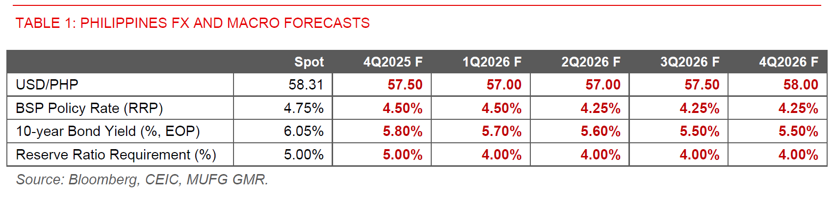 - From an FX perspective, we correspondingly shift our USD/PHP forecast higher, and see the FX pair moving to 57.00 by 2Q2026 from 56.50 previously, reflecting the additional BSP rate cuts.