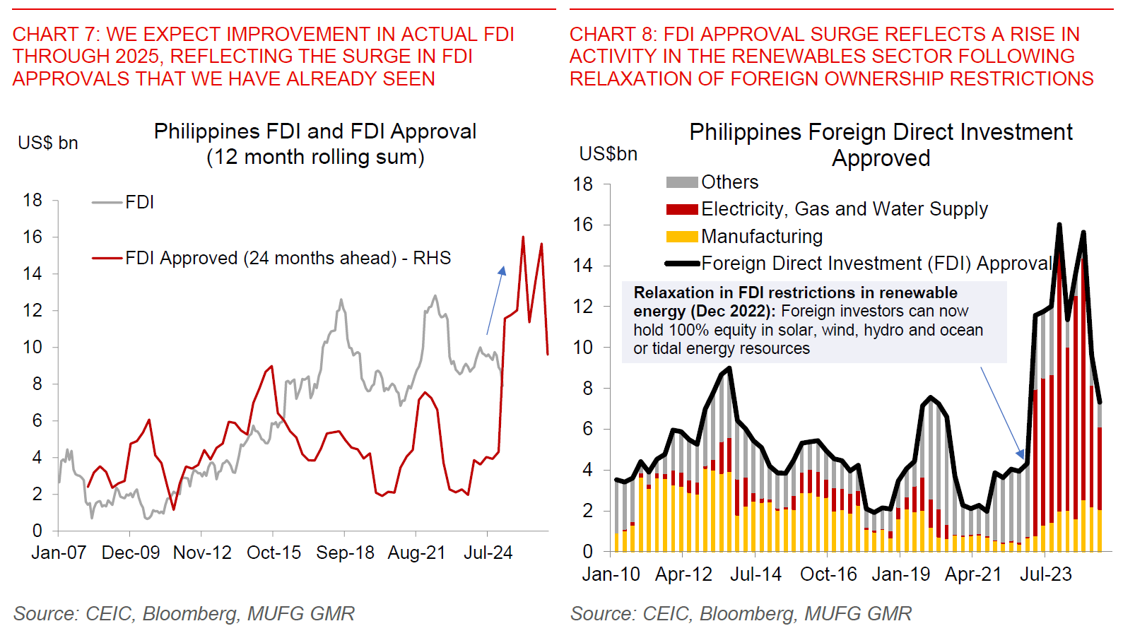• The third factor why we remain positive on the Philippines from a macro and FX perspective is our expectation for actual FDI to improve, reflecting the surge in FDI approvals that we have already seen: FDI approvals into the Philippines have already risen sharply to US$16bn at its peak as of 3Q2024, up from just US$4bn in 2022. This has been driven by a meaningful rise in renewable energy sector projects, helped by removals of foreign ownership restrictions from December 2022. Although FDI approvals have now fallen closer to US$8bn, the key for PHP is that we should start to see some improvement in actual FDI over the next few quarters if the historical relationship between approvals and implemented capital holds. With a relatively large current account deficit of around 3.5% of GDP, this will be important in helping the Philippines fund its current account deficit amidst rising import needs, and hence supporting the Philippines Peso.