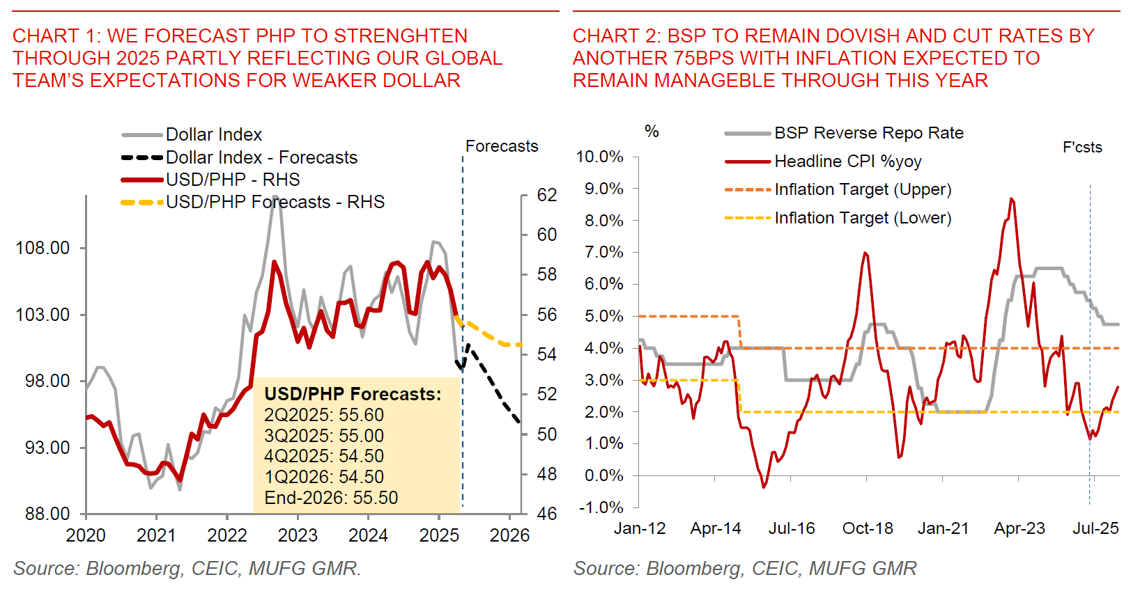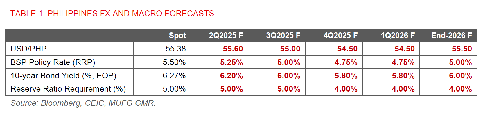We continue to forecast PHP to strengthen to 54.50 against the Dollar by 1Q2026, but also pull forward the pace. We forecast another 75bps rate cuts by BSP