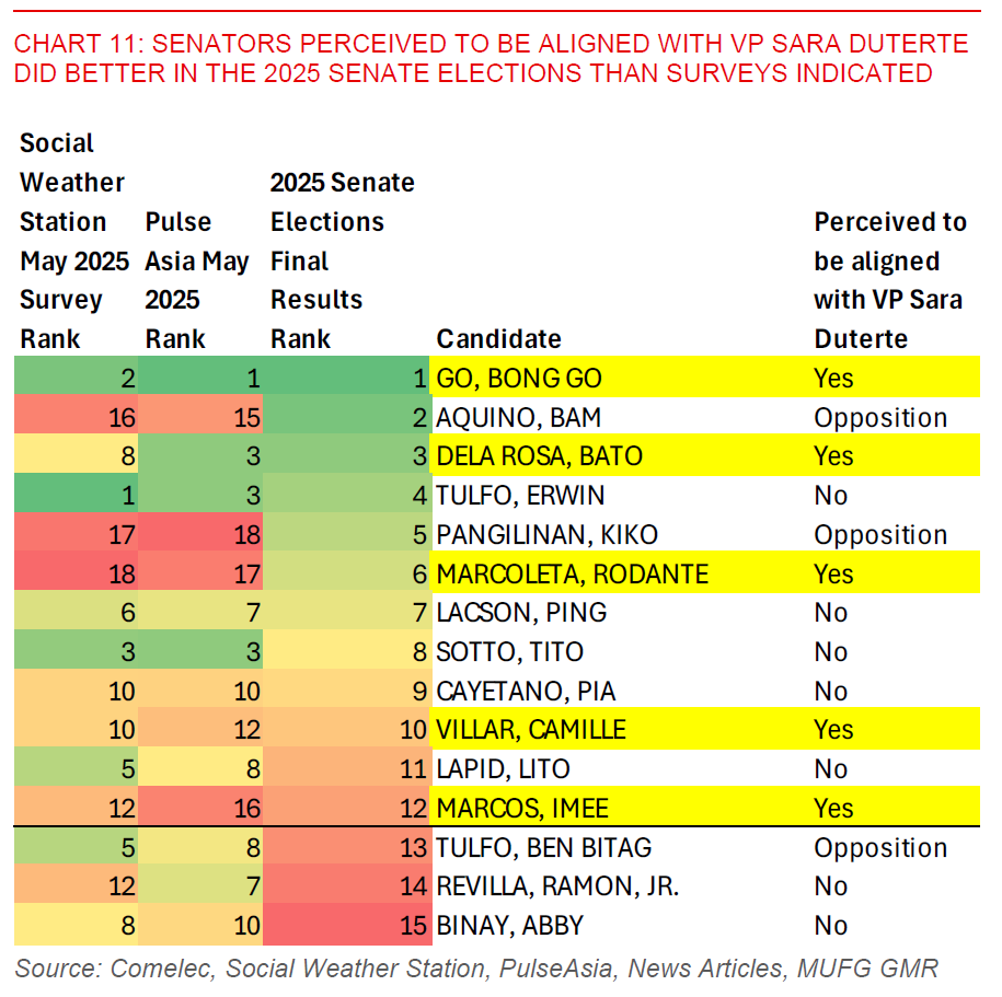 • The upside in our view is that the risks of political instability and protests have likely somewhat diminished given a more divided Senate, but what’s key for the longer-term is the shape of the 2028 Presidential Elections and possible contenders.
