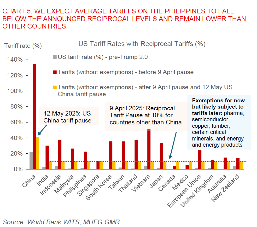 • We also implicitly assume a trade deal with the US will be reached, and for average tariffs on the Philippines to fall below the 17% reciprocal level.