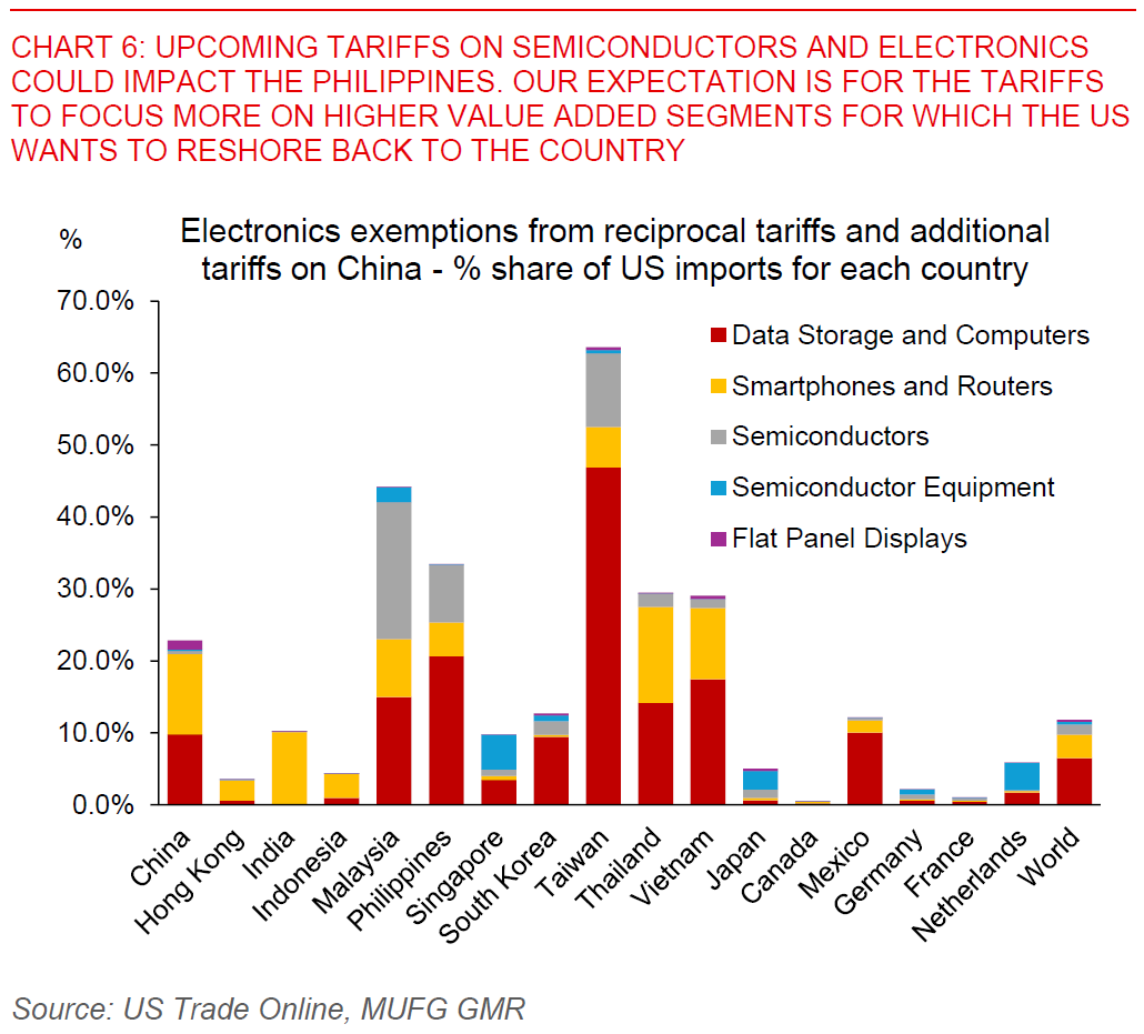 • Second, we expect a trade deal between the US and the Philippines to be reached, and for average tariffs on the Philippines to ultimately fall below the announced 17% reciprocal level. We think a deal is not difficult to be reached given the Philippines only has a very small trade deficit with the US of around US$5bn, together with low perceived indirect supply chain linkages with China in its US exports. There are nonetheless some risks on upcoming semiconductor and electronics tariffs, which could impact the Philippines. Our implicit assumption is that tariffs will be focused on segments that the US wants to reshore such as higher-end semiconductors and AI chips, and as such the Philippines should still come up relatively better off. Net-net our macro and FX forecasts reflect our assumptions for relatively lower tariffs to be imposed on the Philippines, coupled with the more domestic-oriented nature of its economy.