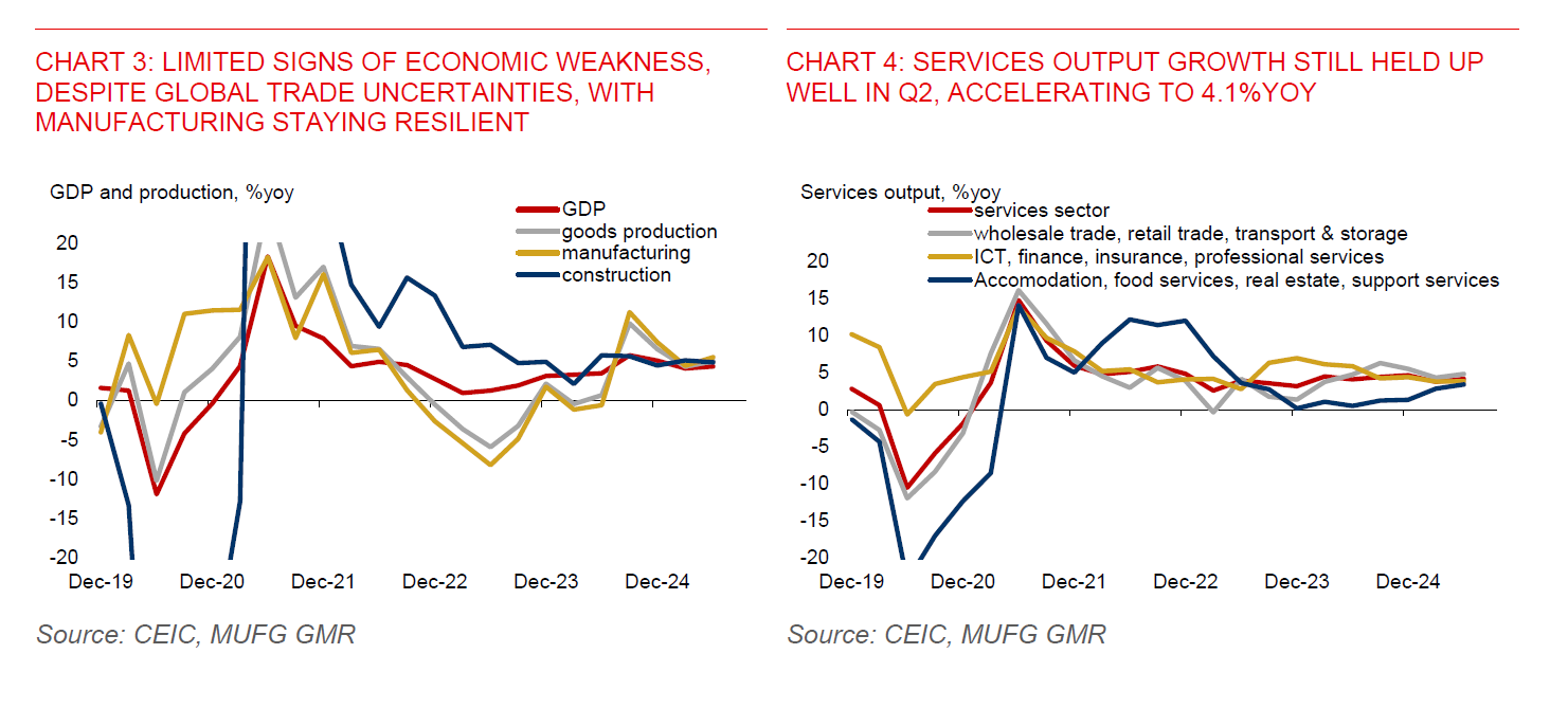 - Singapore’s economic growth will be subdued in H2, but it is likely not recessionary. And while US reciprocal tariffs are scheduled to take effect on 1 August, their impact may still be partial in Q3. More pronounced tariff effects are likely to be felt only in Q4 and into early 2026. There may still be some residual support from export frontloading in Q3, though this is expected to moderate. Recent macro data from both the US and China also suggest that growth remains resilient, helping to cushion external demand. Importantly, Trump has previously delayed the implementation of reciprocal tariffs, and with the US still engaged in trade negotiations with several countries, the 1 August date may not be definitive.