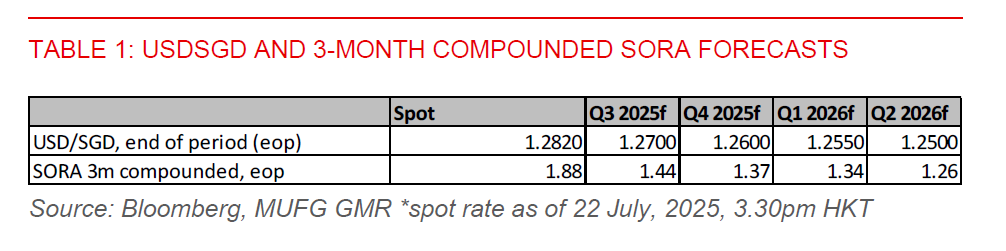 - The SGD has weakened modestly by 0.5% against the US dollar since 4 July, following President Trump’s announcement of new reciprocal tariff rates on trading partners. However, it still retains most of its year-to-date gains, which exceed 6%. The S$NEER has also appreciated toward the upper bound of MAS’s FX policy band, despite policy easing in January and April – and with the possibility of further easing. This suggests limited room for SGD outperformance. That said, with the Fed expected to cut rates in September and the USD likely to weaken, we expect USDSGD to drift modestly lower toward the 1.2600 to 1.2650 range by end-2025.