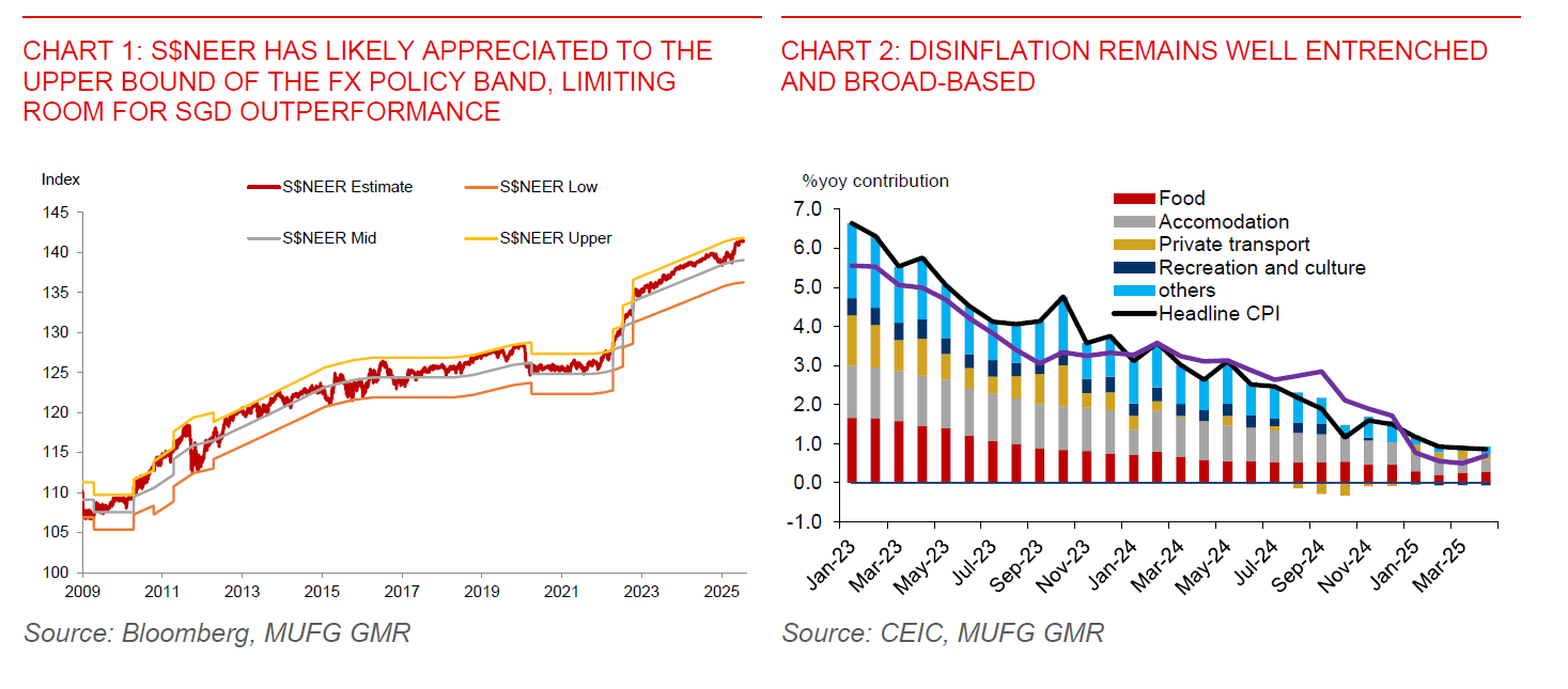 - MAS remains in a policy easing cycle amid heightened global trade uncertainties, with the balance of risks tilted toward growth rather than inflation. A pre-emptive MAS easing move in July is possible, in anticipation of a tariff-induced slowdown in H2. However, we are of the view that MAS will wait until the October meeting before adjusting policy further. The growth outlook remains subject to large uncertainty, while inflation risks could be two-sided. Moreover, the MAS has begun to unwind its restrictive policy in January and April, suggesting that some policy accommodation has already been delivered.