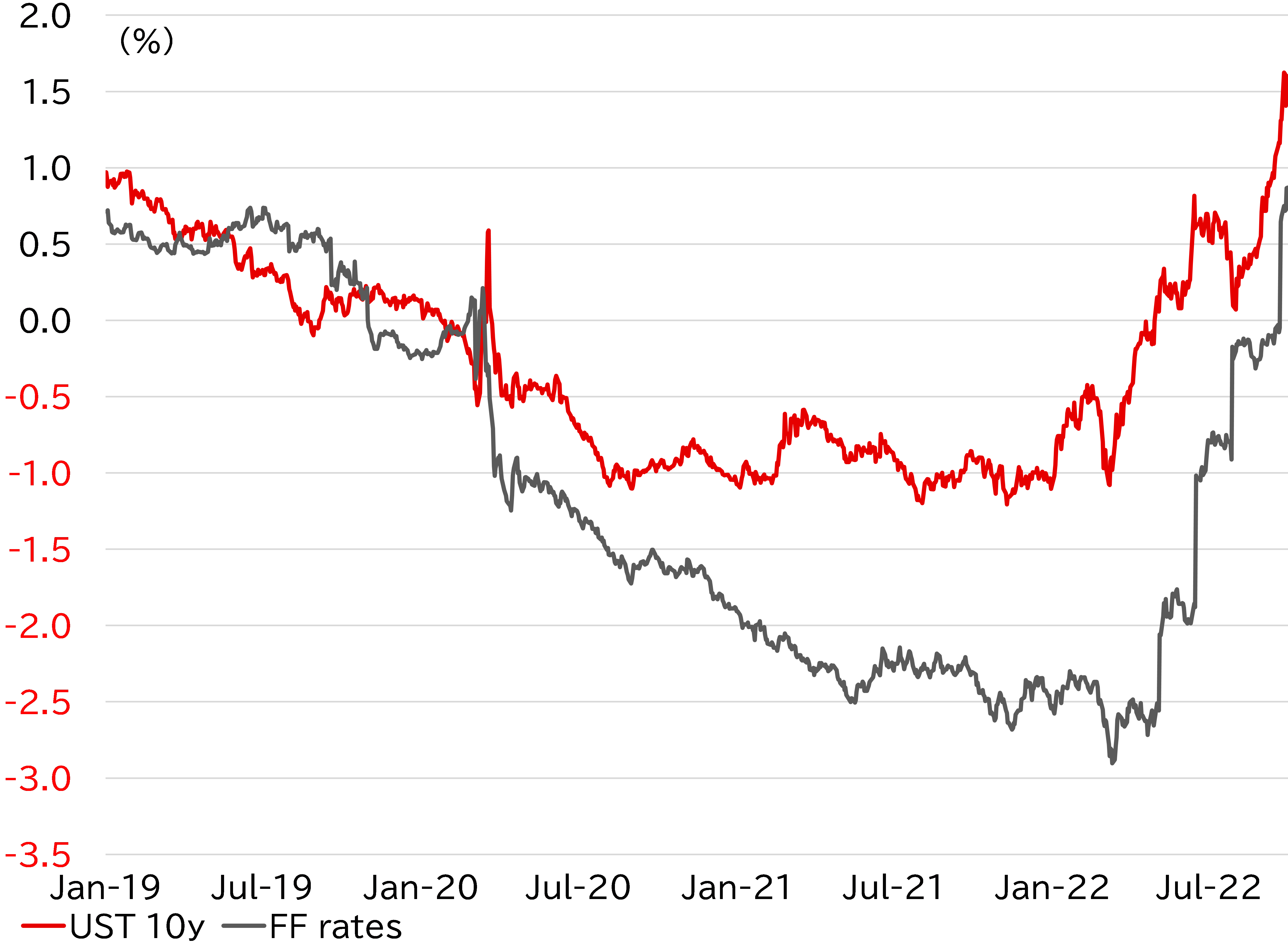We think the driving force behind the USD/JPY's sharp rise over the last six months has been the Fed's increasingly hawkish monetary policy stance, the accompanying rise in UST yields, especially in the intermediate sector, and the strengthening of the dollar. Yen depreciation due to the sense of divergence in monetary policy in Japan and abroad was fueled by the change in the Fed's stance.