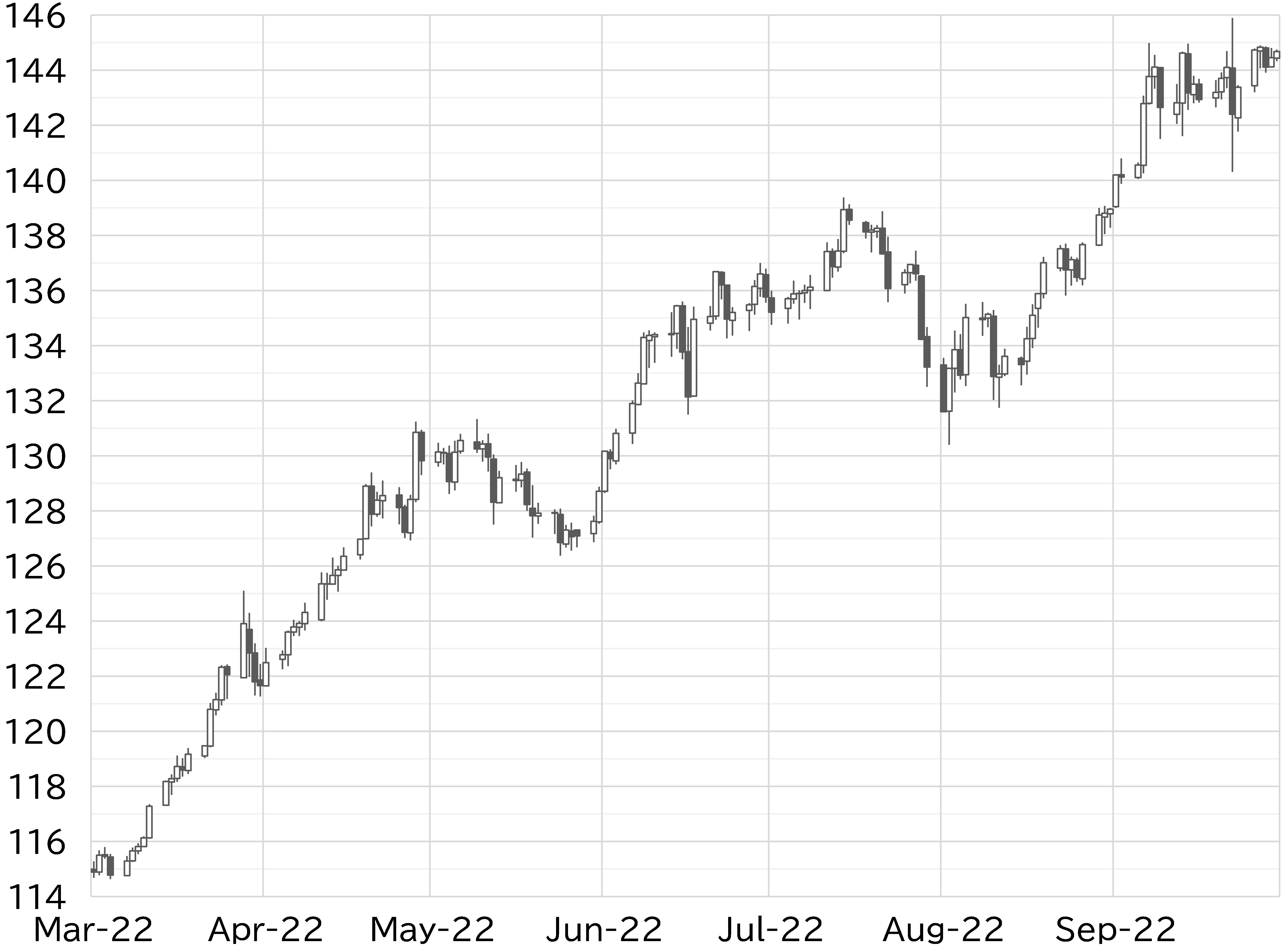 The USD/JPY opened the month at 139.34. It rose to above 140 on 1 September, with the dollar continuing to strengthen following Fed Chair Jerome Powell's speech on 26 August. It remained top-heavy for a while after breaking past this key level but rose swiftly to beyond 142 on 6 September in European trading hours as the yen weakened amid a dearth of catalysts. The dollar strengthened following the stronger than expected US ISM Non-Manufacturing Index released on the same day, driving the USD/JPY to around 143. The pair rose to 144.99 on 7 September after a US newspaper reported that the Fed was likely to raise rates by 75bp at the September FOMC. The psychologically significant watershed of 145 became a ceiling, but the unexpectedly strong US CPI released on 13 September saw the USD/JPY test 145 again on 13–14 September. However, the pair topped out below 145 after the Nikkei reported that the BOJ, which is responsible for executing foreign exchange interventions, had conducted a currency rate check.