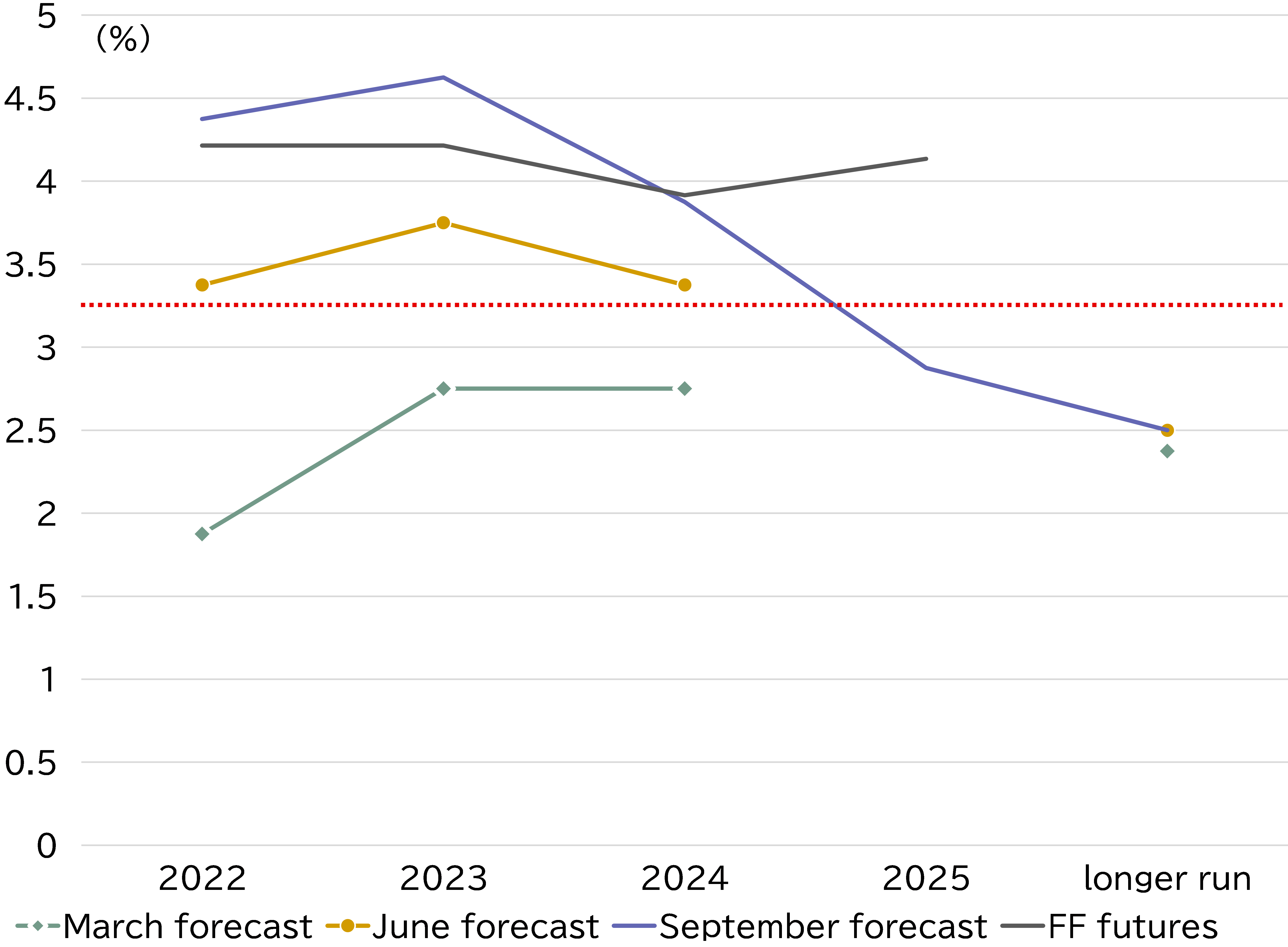 The outlook for policy rates through 2025 presented at the September FOMC meeting was higher than the market had expected (Figure 3). Combined with the UK gilt shock that followed, this resulted in the 2y UST yield temporarily rising past 4.30% and the 10y yield above 4.00%. The outlook for the policy rate shown in the dot plot therefore seems to have been largely factored in. Meanwhile, regional Fed reports have pointed to signs of a slowdown in the US economy and inflation, and leading economic indicators are also trending downward. The labor market remains tight, but higher mortgage rates are softening real estate prices. It appears that the Fed's stance of curbing inflation even if it means dampening the economy has already been put into practice. In addition, the 75bp rate hike in September has pushed the federal funds rate well above the neutral rate of interest, meaning it has entered positive territory even in real terms (Figure 4) and that monetary conditions in the US will tighten in earnest from here. In other words, the slowdown in the US economy looks poised to move into full gear. The Fed has also accelerated the scaling back of its balance sheet since September. These conditions are putting downward pressure on stock prices, with the S&P500 falling to its lowest level since December 2020. However, the Fed looks prepared to accept a further slide in stock prices judging by its current stance.