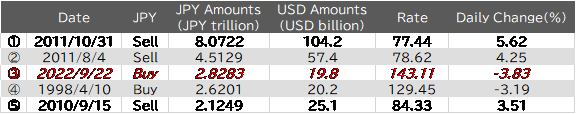 (Note) "Exchange rate" is the median price range on the day of intervention; "intraday maximum fluctuation" is the difference between the high and low prices.