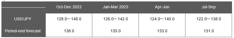 Our forecast range estimates the high and low for each quarter. The period-end forecast is our forecast for USD/JPY at 17:00 New York time at the end of each quarter.